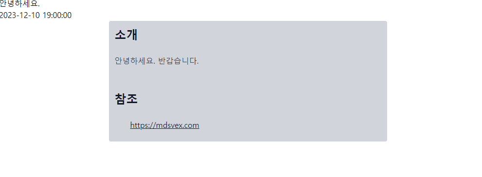 --- title : '안녕하세요.' date : '2023-12-10 19:00:00' --- ## 소개 안녕하세요. 반갑습니다. ## 참조 - [https://mdsvex.com](https://mdsvex.com/docs)4. 실행결과 확인