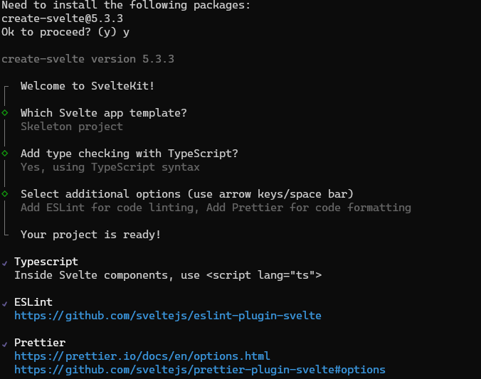 seveltkit 프로젝트 생성명령어를 통해 프로젝트를 생성한다. 본 예제에선 typescript 를 선택했는데, javascript 방식으로 선택해도 별 상관없다.