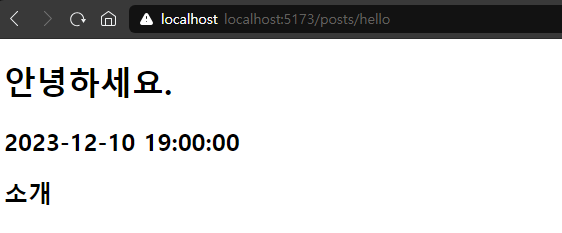 export const load = (async ({params : { slug }}) => { const post = await import(`../${slug}.md`); const { title, date } = post.metadata; return { title, date, content : post.default, }; });수정이 완료되었다면 npm run dev 명령어 재실행 후 기존 경로에서 추가적으로 "/hello"를 붙여보자. 작성했던 markdown 파일 내용이 보일 것 이다.