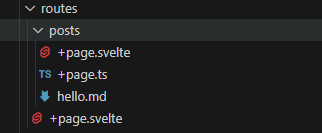 markdown 인식여부 확인을 위해 routes 경로 하위에 posts 경로를 생성하고, +page.ts, +page.svelte, hello.md 을 생성한다.