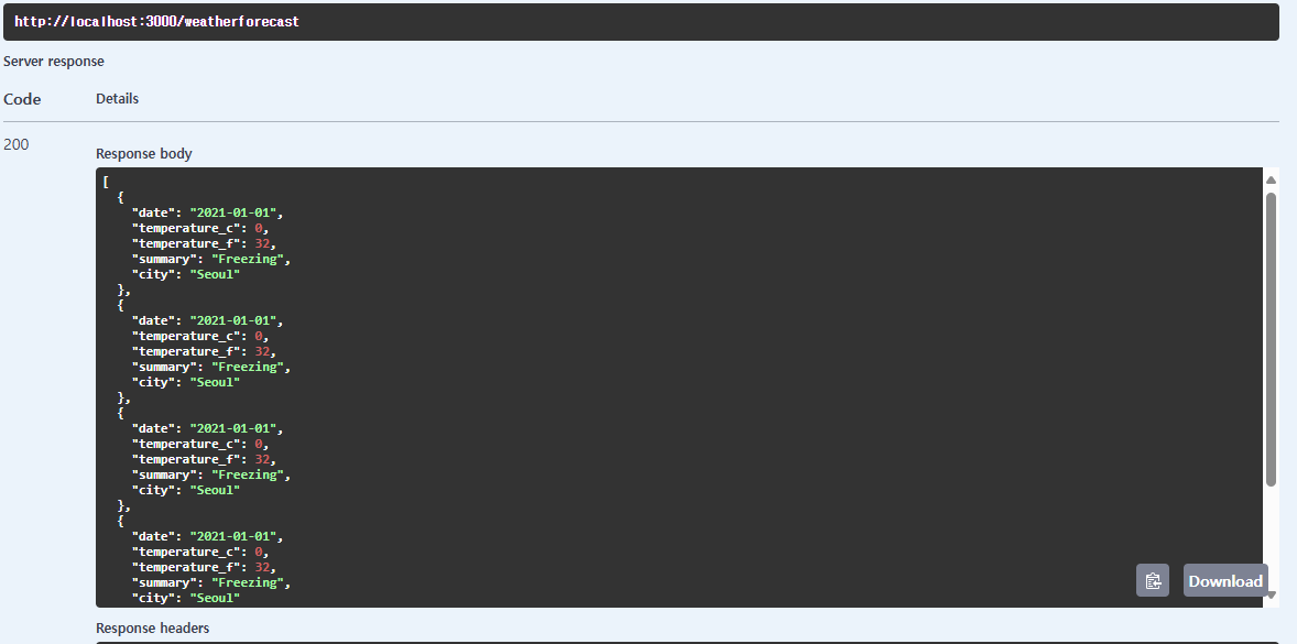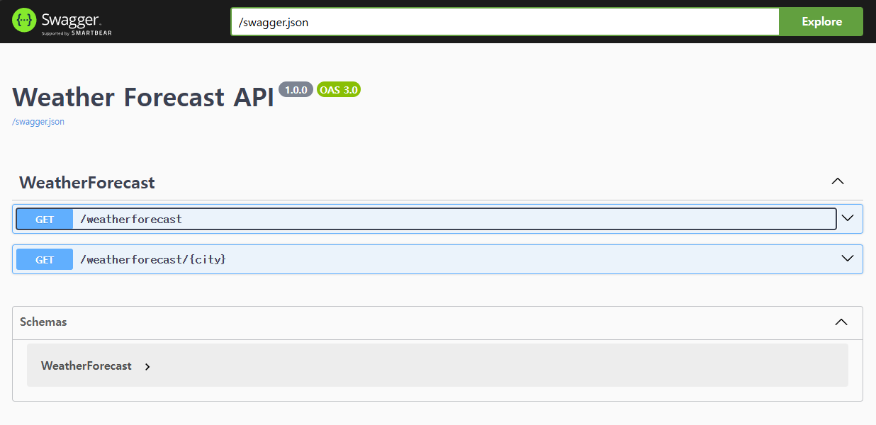 실행 후 브라우저에서 http://localhost:3000/swagger 접속시 2개의 get endpoint를 제공하는 swagger-ui가 나온다.