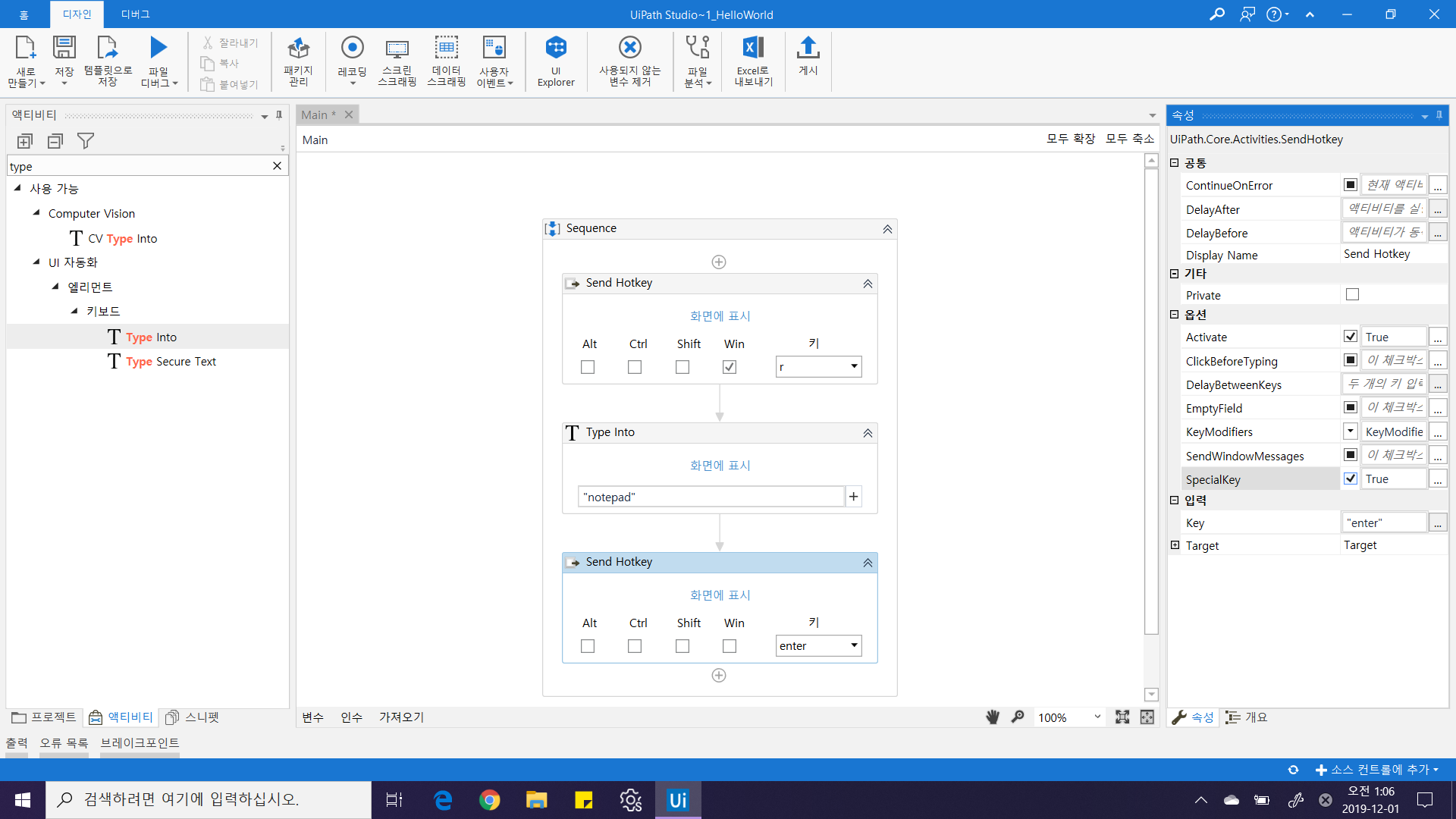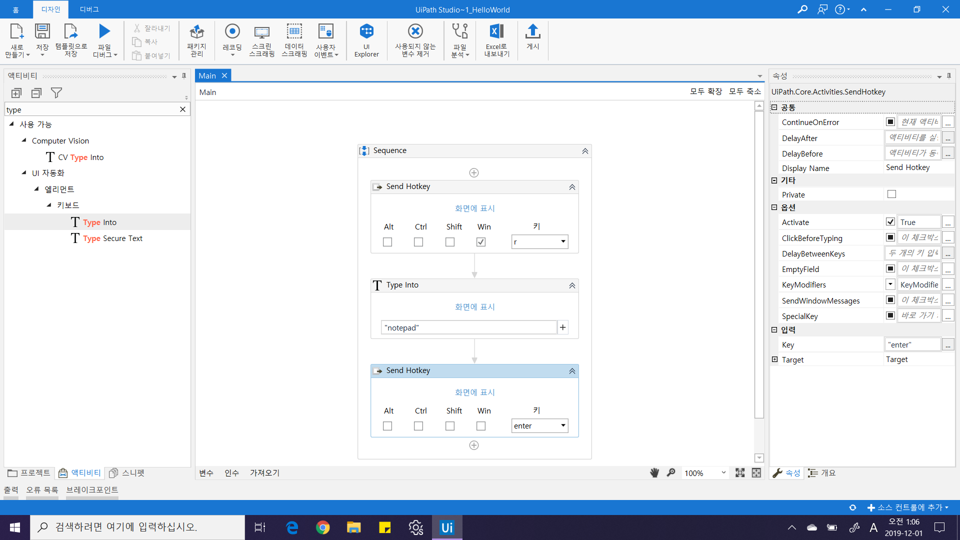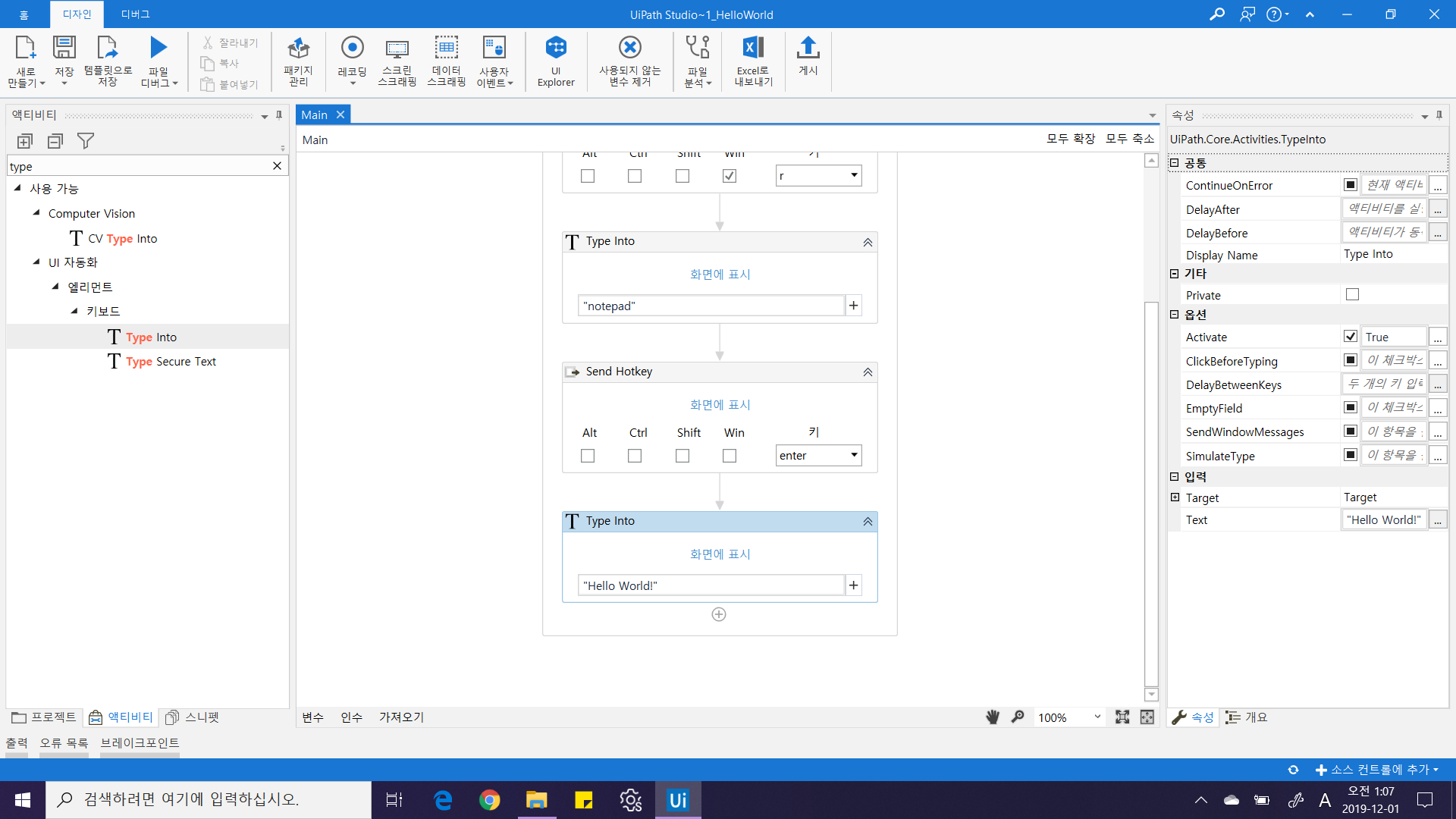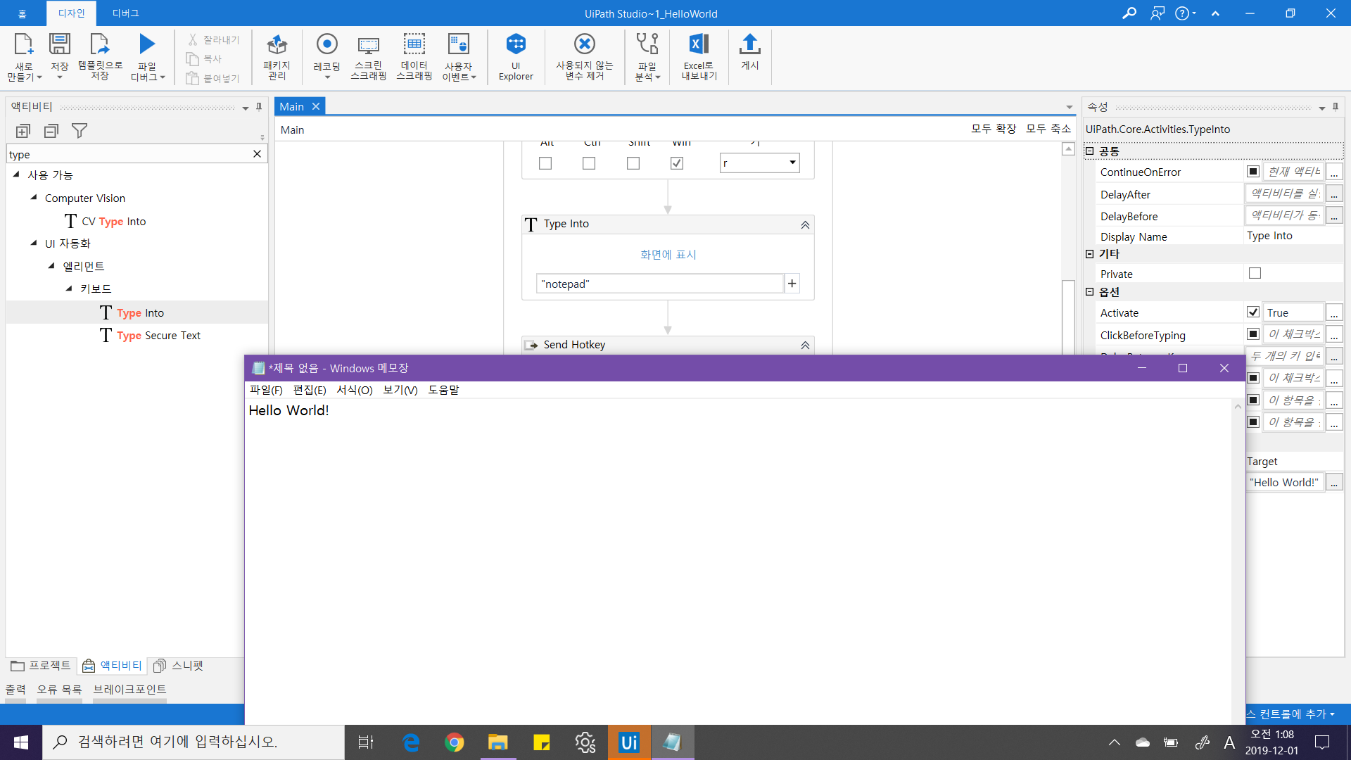거의 다 왔습니다. 이제 "Hello world!" 만 입력하면 됩니다. 이전 단계에서 글자를 입력하는 Activity인 Type Into를 추가한 후 "Hello world!"를 입력해주세요.