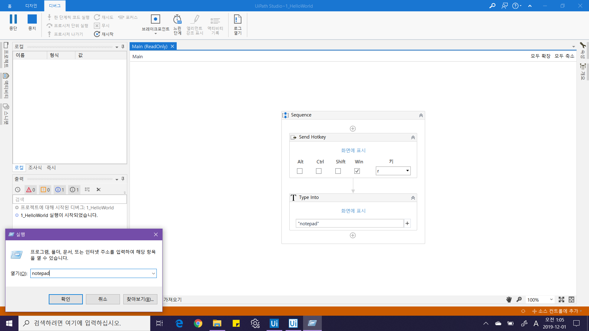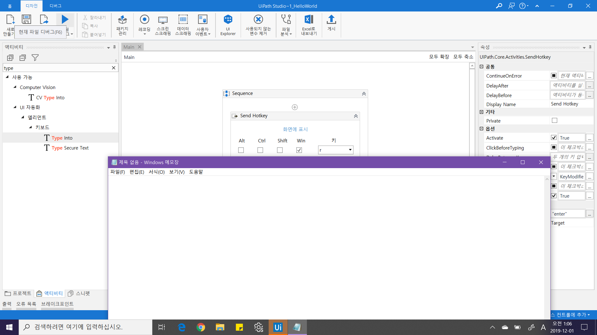 * 다른 실행중인 프로그램은 모두 종료해주세요.* UiPath 스튜디오가 메모장을 가리게 될 경우, Ctrl+F5 키를 눌러 실행해주세요.