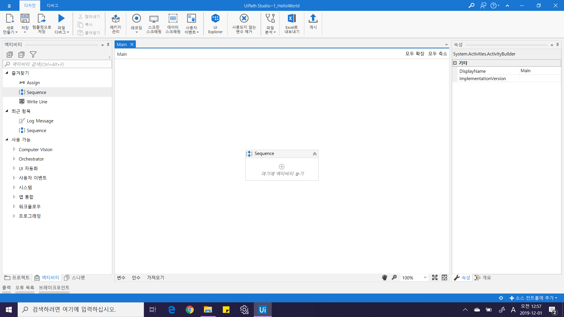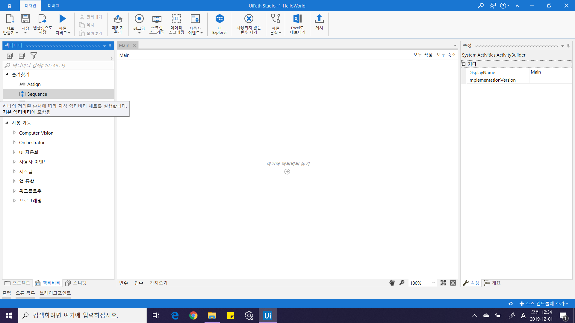 Main.xaml 화면을 열어보면 화면 한가운데 "여기에 액티비티 놓기" 표시한 채 아무 것도 없는 다소 허전한 모습이 우리를 반겨줍니다. 여기에 액티비티 놓으라니 놓아야 겠죠? :) 프로젝트 뷰 하단에 액티비티 탭을 선택하여 액티비티 창을 선택합니다. 그리고 즐겨찾기 항목에 있는 "시퀀스 액티비티(Sequence Activity)" 선택하여 마우스로 끌어 놓아주세요.