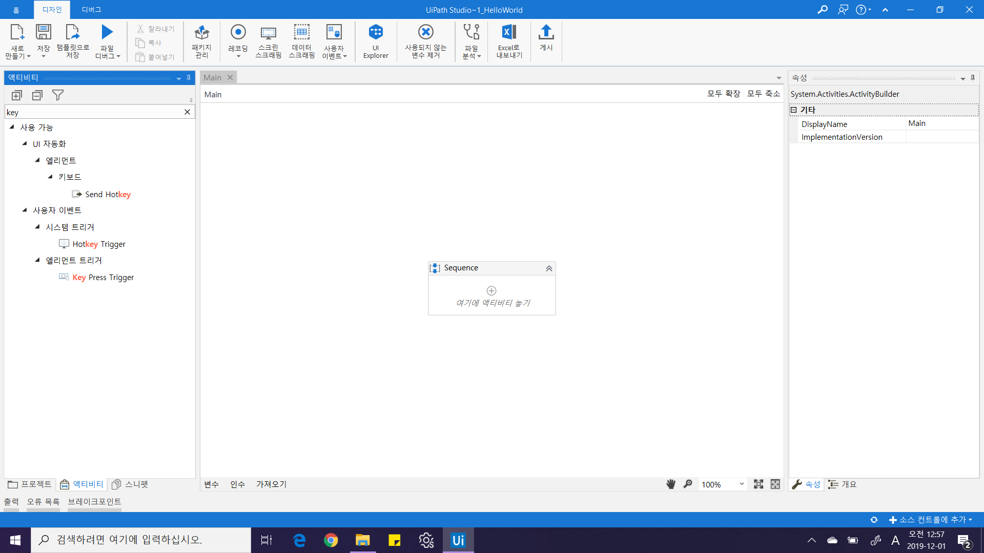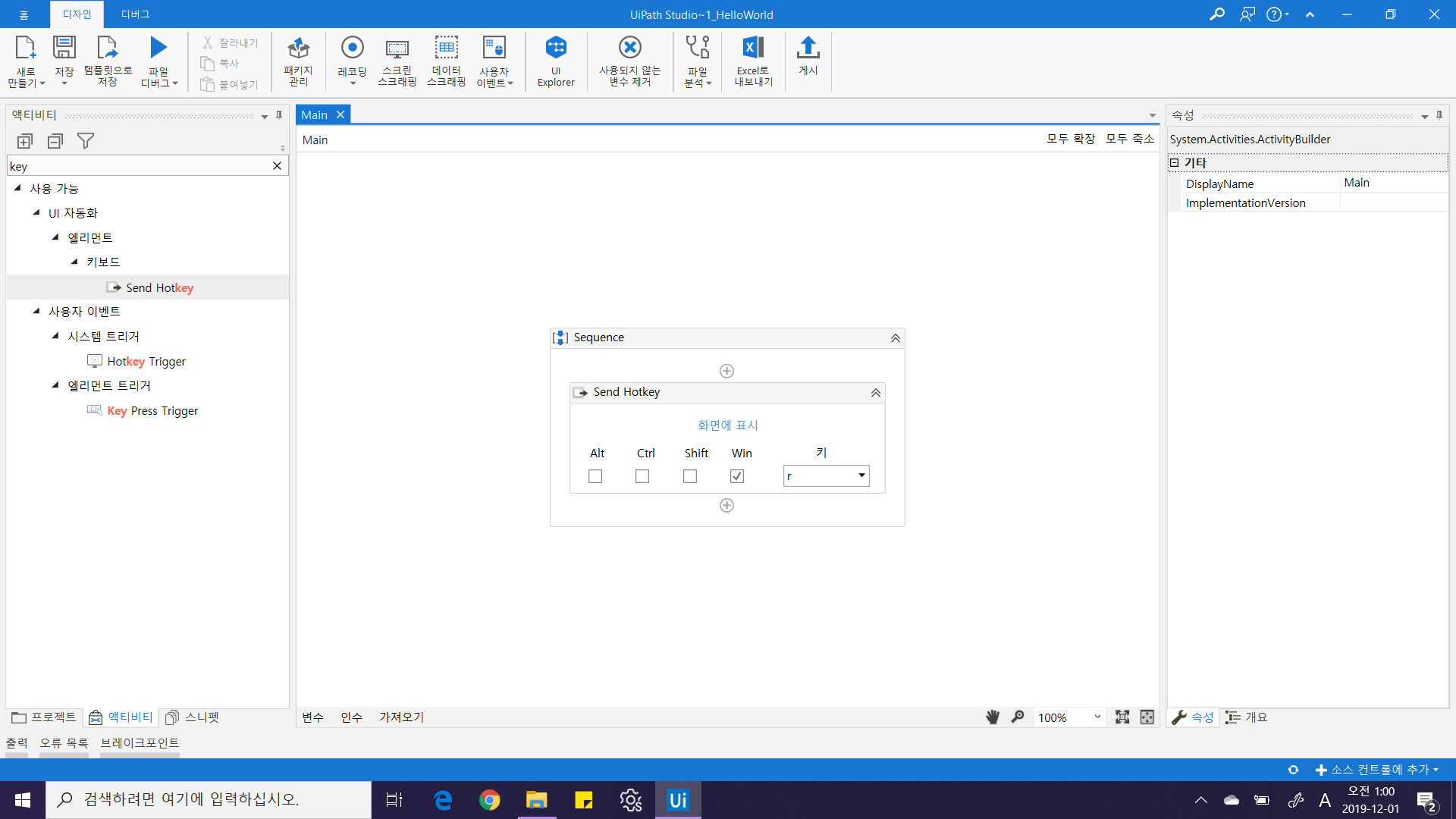 * 시퀀스 액티비티 : 각 작업 단계를 의미하는 "액티비티(Activity)"를 한 묶음으로 묶어주는 기본 액티비티입니다. 해당 액티비티 자체는 아무작업도 수행하지 않지만, 해당 액티비티 안에 담긴 자식 액티비티는 담겨진 순서에 따라 위에서부터 아래로 수행됩니다. 특정위치에 2개 이상의 작업 액티비티를 담을 경우 자동으로 생성되기도 합니다.4. Windows 실행 단축키(Win+R) 입력을 위한 Send Hotkey 액티비티 추가