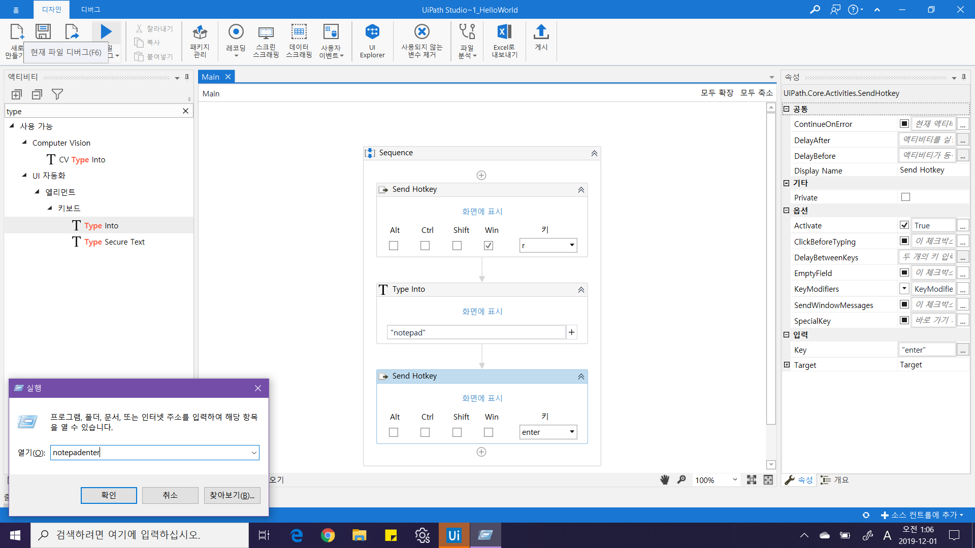6. notepad 입력을 위한 Type Into 액티비티 추가