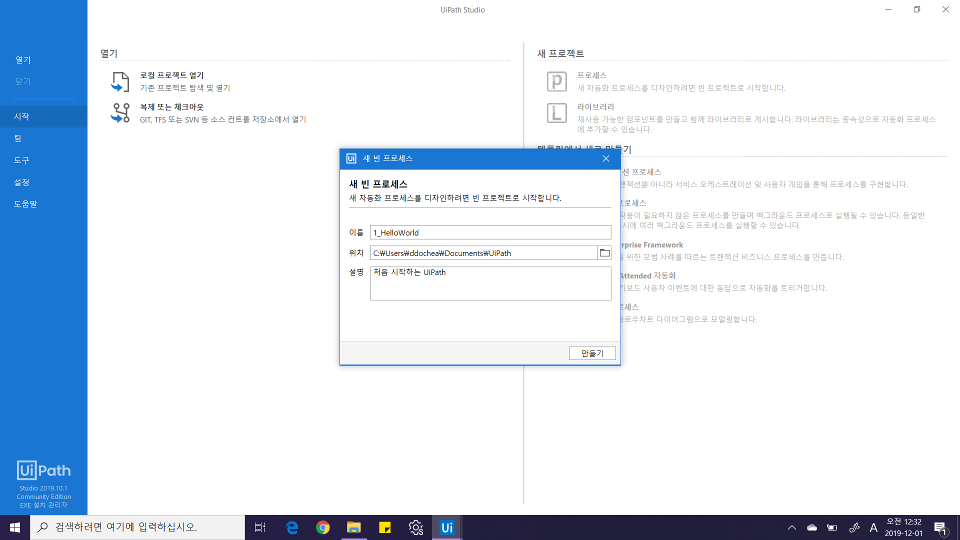 UiPath Studio를 열고 [새 프로젝트] 에서 "프로세스"를 선택해주십시오. 그리고 아래와 같이 프로젝트 이름과 설명을 작성 후 만들기 버튼을 눌러주세요.