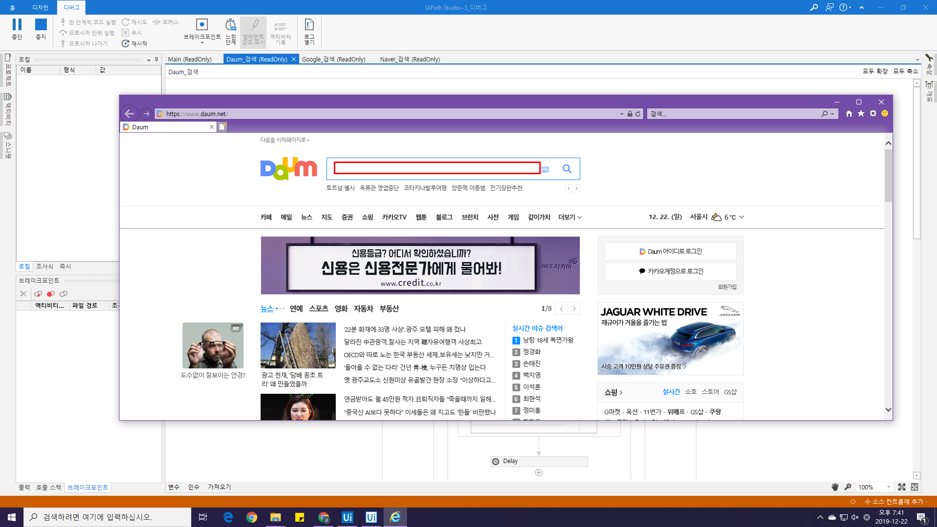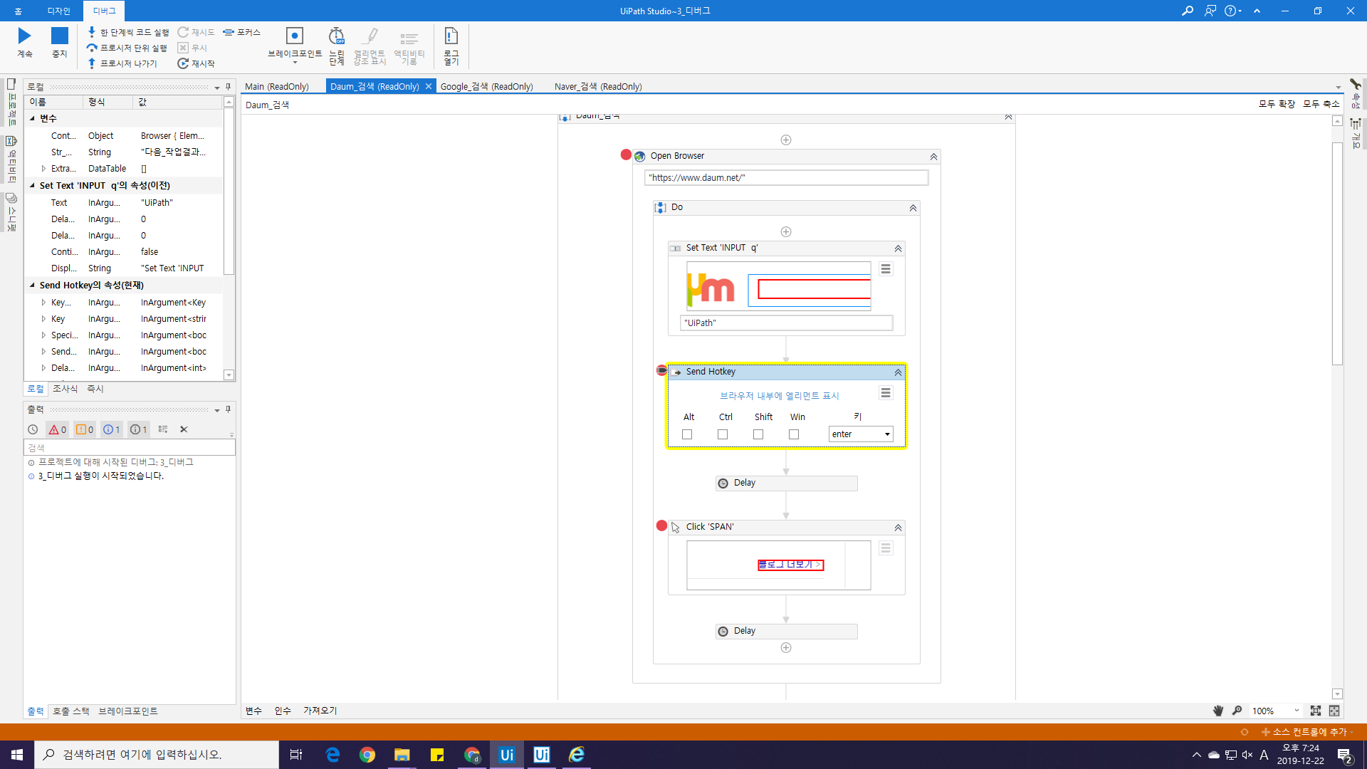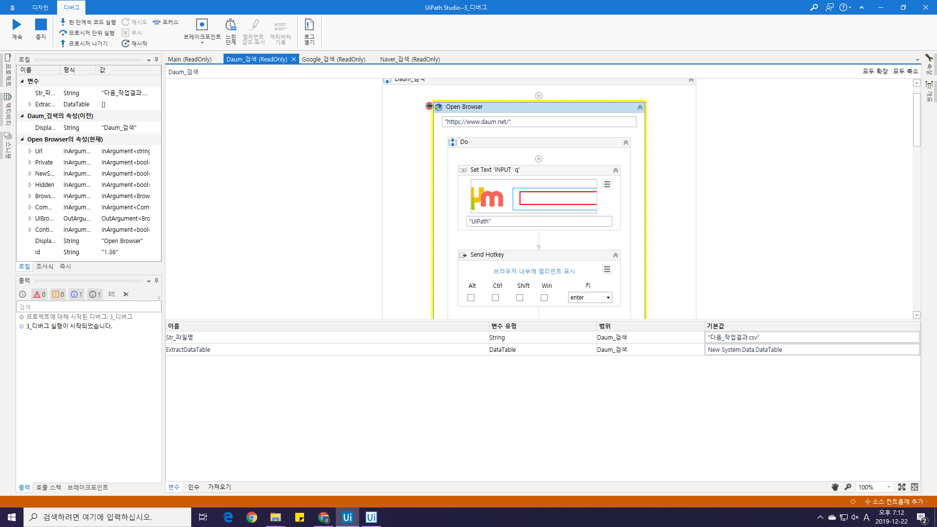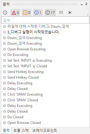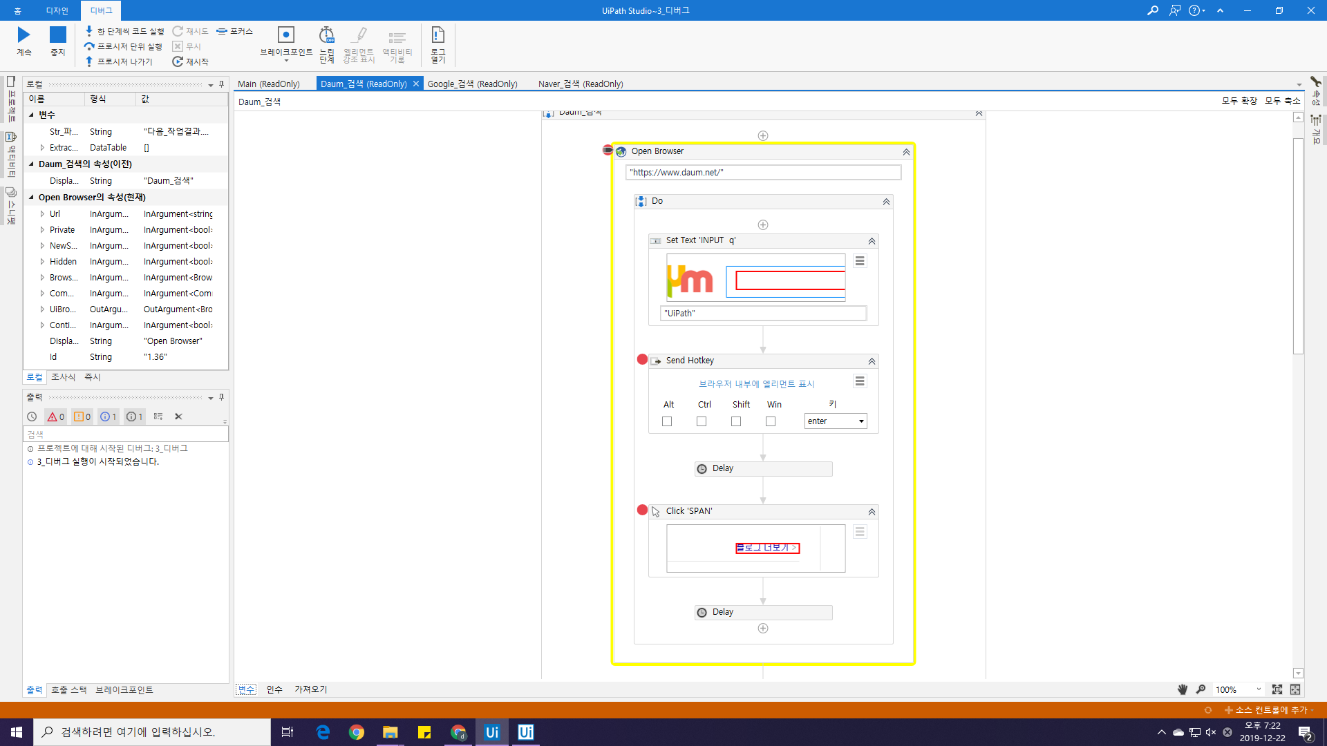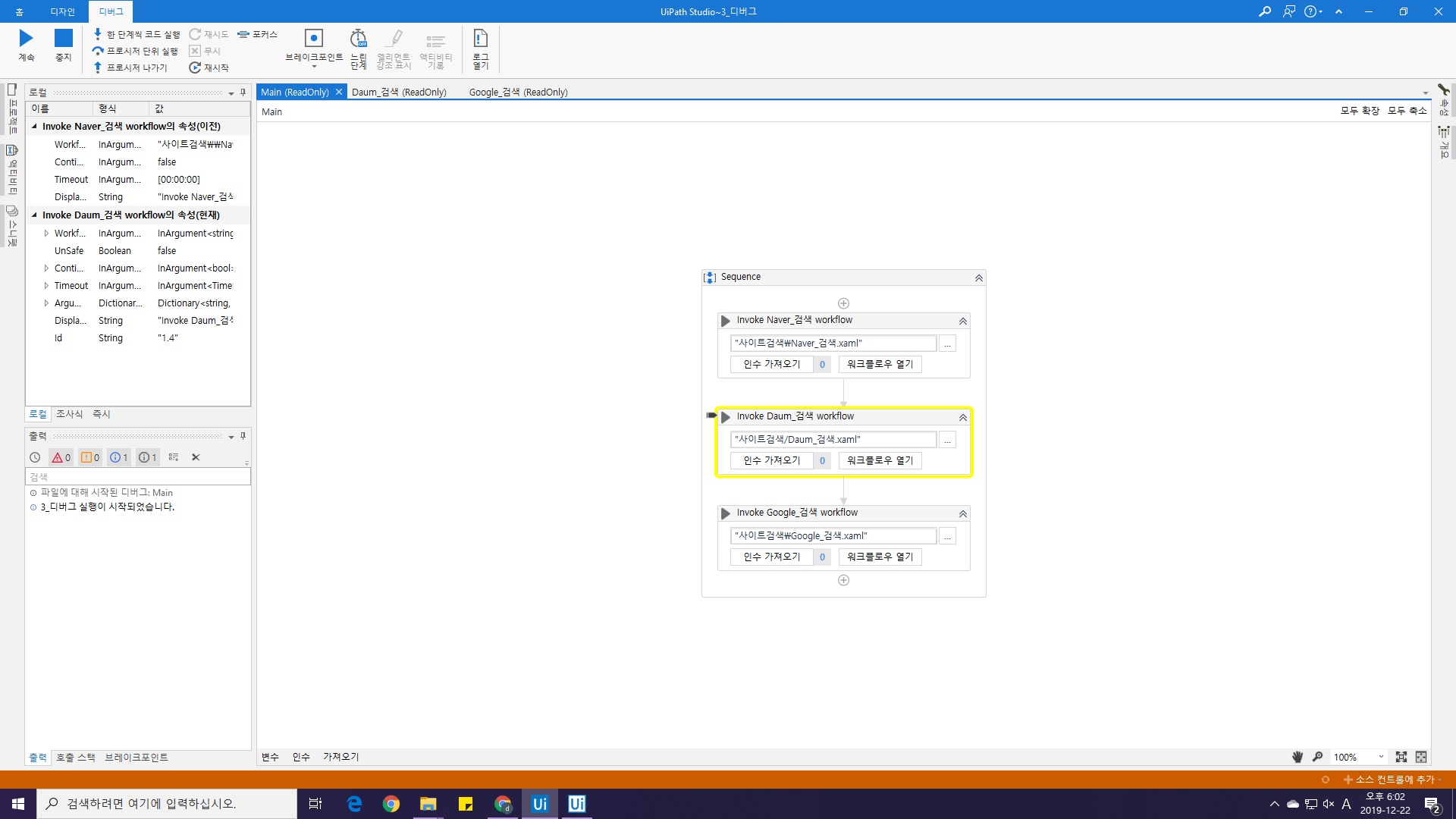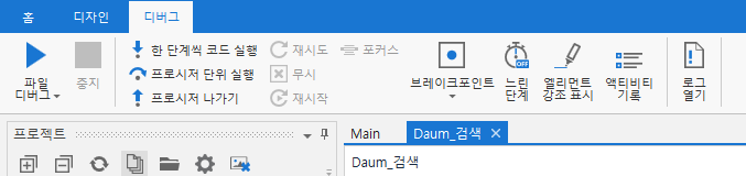 파일 디버그는 Main부터가 아닌, 작업창에서 선택한 워크플로우만 단독으로 실행시킬때 사용하는 기능입니다. "Daum_검색" 워크플로우를 연 뒤, 파일디버그 버튼을 선택하거나, F6 키를 입력해주시면 Daum 사이트만 검색하는 것을 확인하실 수 있으실 것입니다.