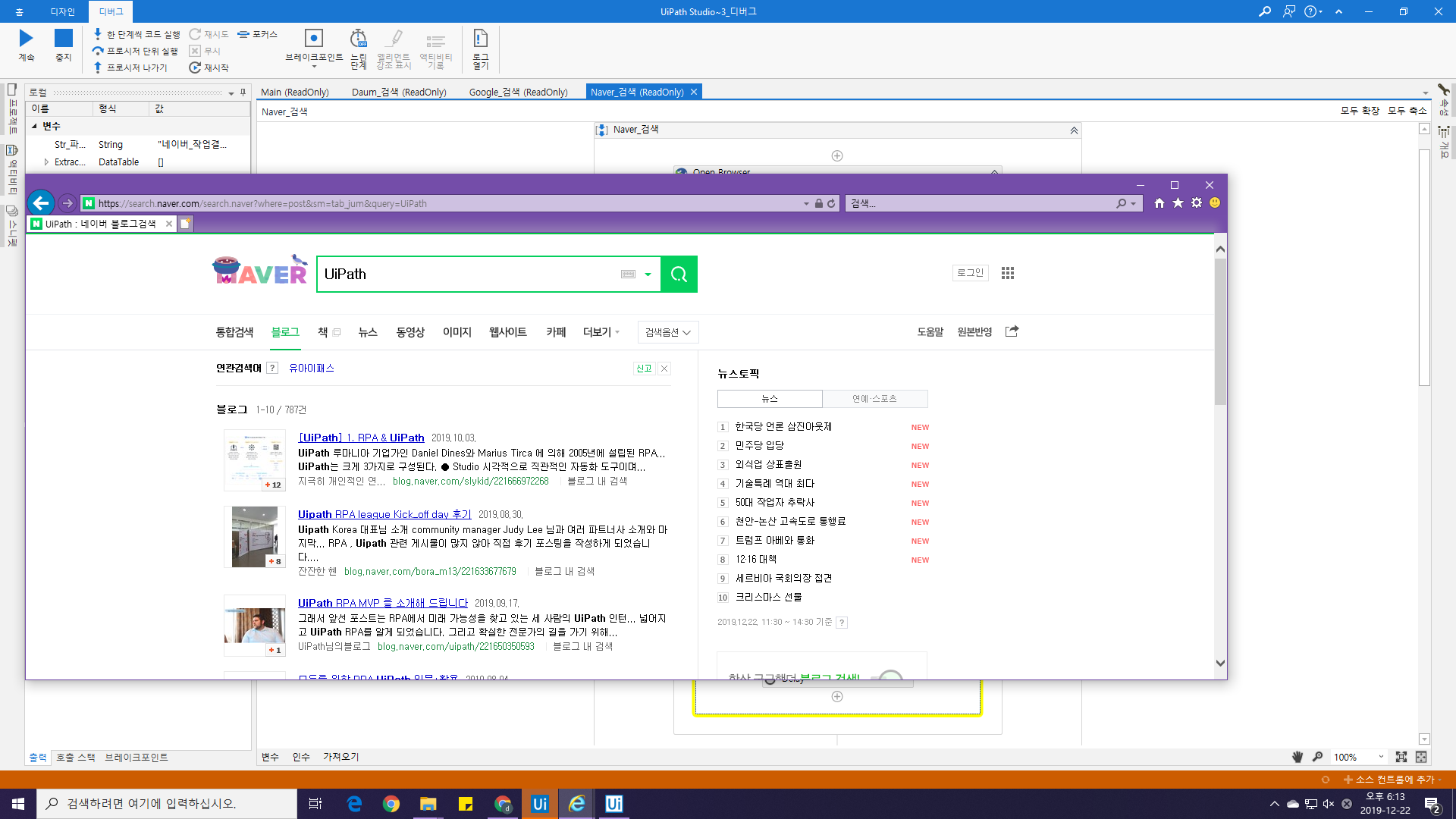 수집이 완료된 이후 포커스가 멈춘위치 네이버 워크플로우의 모든 동작을 완료시킨 후 다음 워크플로우에 포커스가 멈춰있는 것을 확인할 수 있습니다.