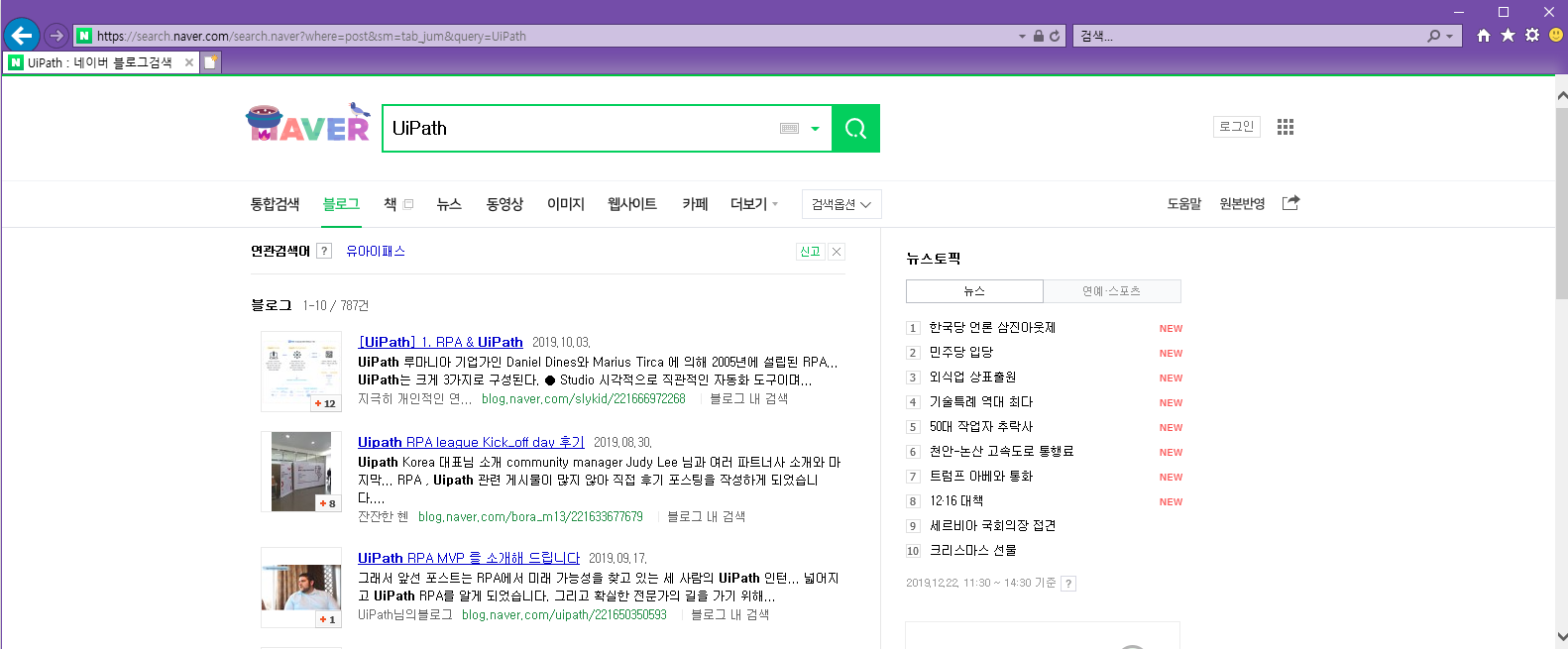 정상적으로 진행했다면 네이버 페이지는 아래와 같이 블로그 검색결과를 보여주는 상태로 떠 있을 것입니다.