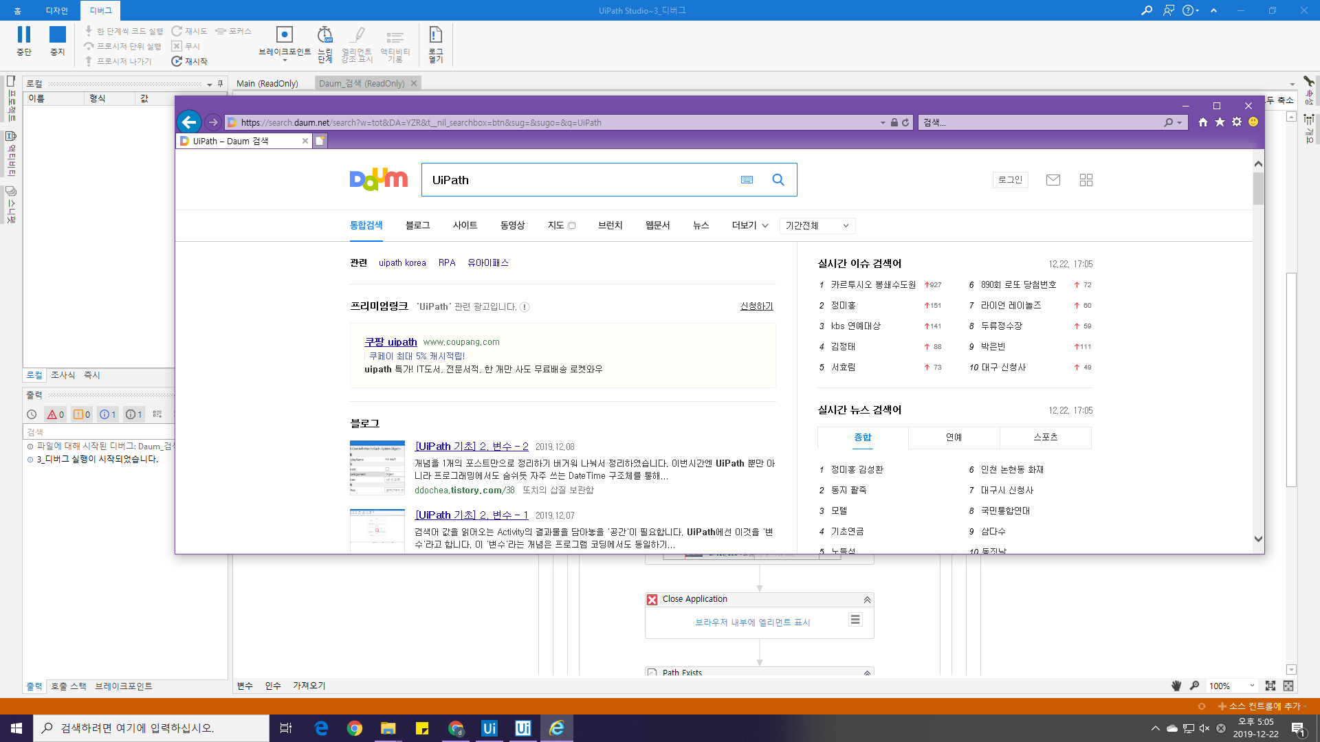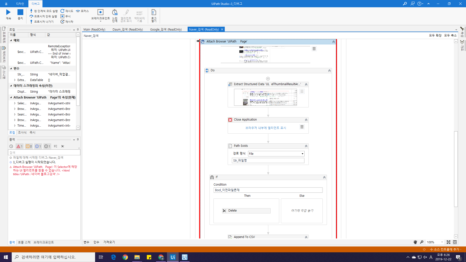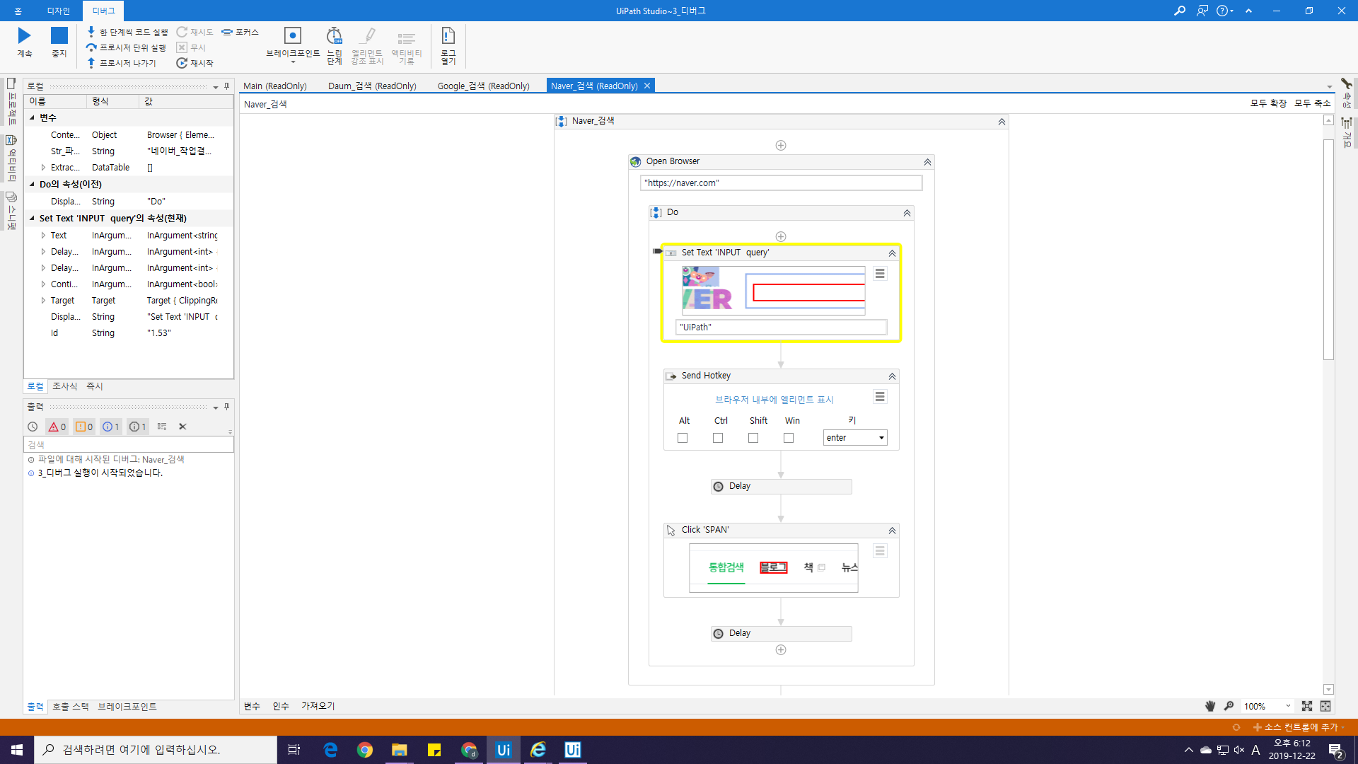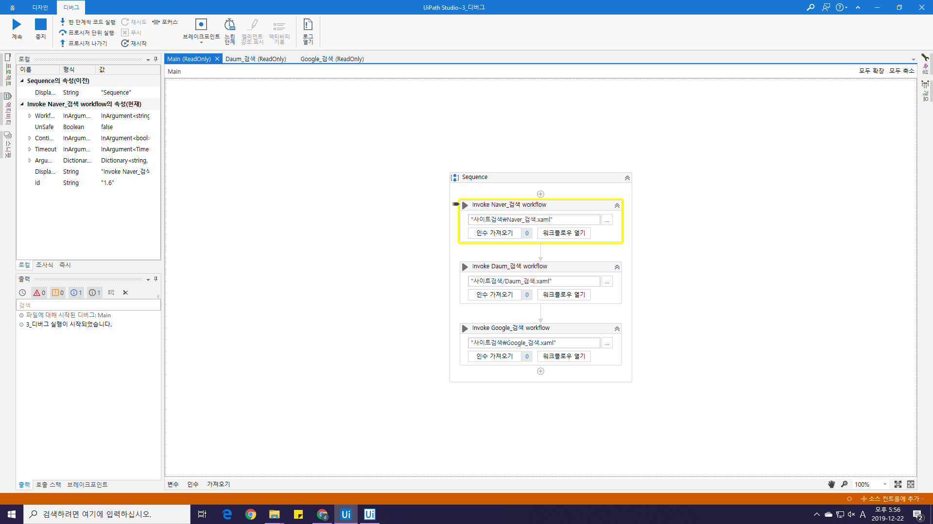 힘의차이가 느껴지시나요? 선택한 Open Browser의 하위 항목이 일괄적으로 실행된 것을 확인할 수 있습니다.이번엔 범위를 넓혀서 Main 워크플로우를 예제로 들어보겠습니다. 브라우저를 닫고, 디버그를 중지시킨 뒤, Main 워크플로우를 선택해주세요. 그리고 "Invoke Naver_검색 workflow" 단계까지 한 단계씩 코드 실행 해주세요.