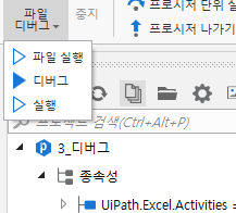 - 파일 실행 : 디버그를 진행하지 않고, 선택한 워크플로우만 실행합니다. 단축키는 Ctrl+F6입니다.