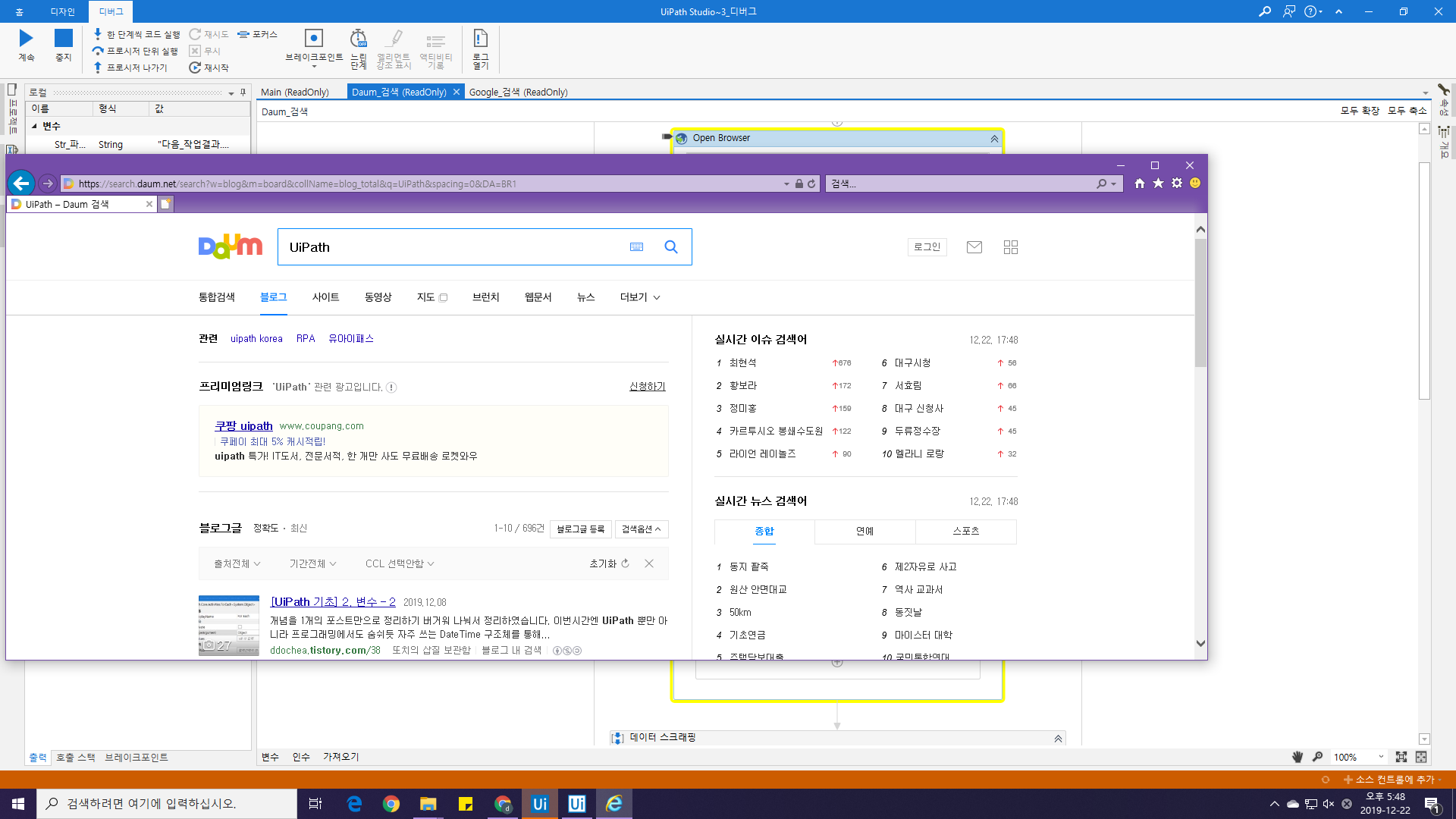 일괄적인 실행이 아닌, 액티비티를 한 단계씩 실행해야할 때 사용합니다. "Daum_검색" 워크플로우를 선택하고 한 단계씩 코드실행을 선택하면 스튜디오가 아래의 화면처럼 표시됩니다.