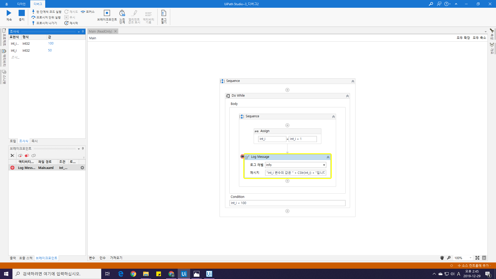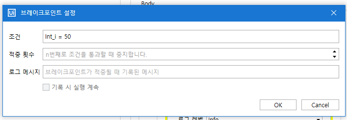 이번 예제는 Int_i가 +1씩 증가되므로, 조건에 Int_i가 50이 되면 멈추도록 설정해보겠습니다.