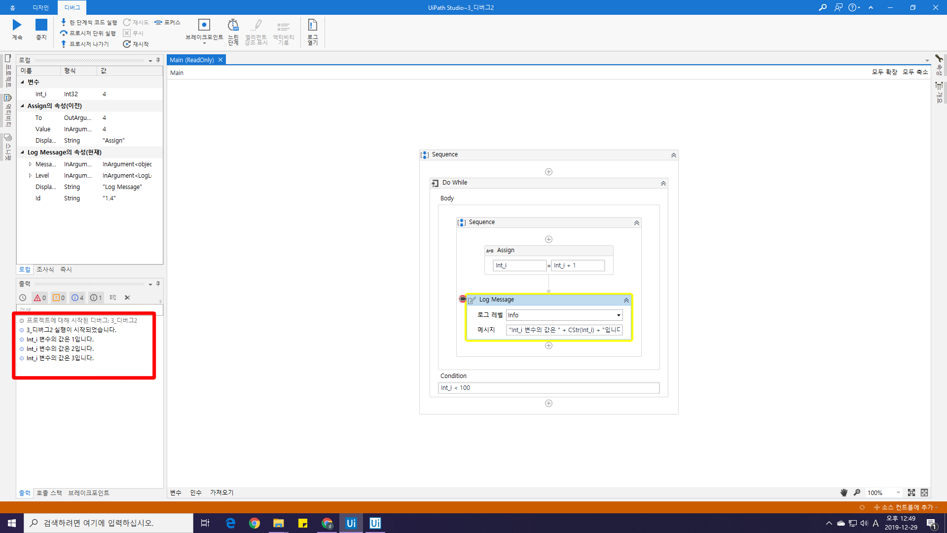 예제를 열어보시면 Int_i 변수가 100이 넘을때까지 +1씩 더해주는 아주 간단한 예제입니다.