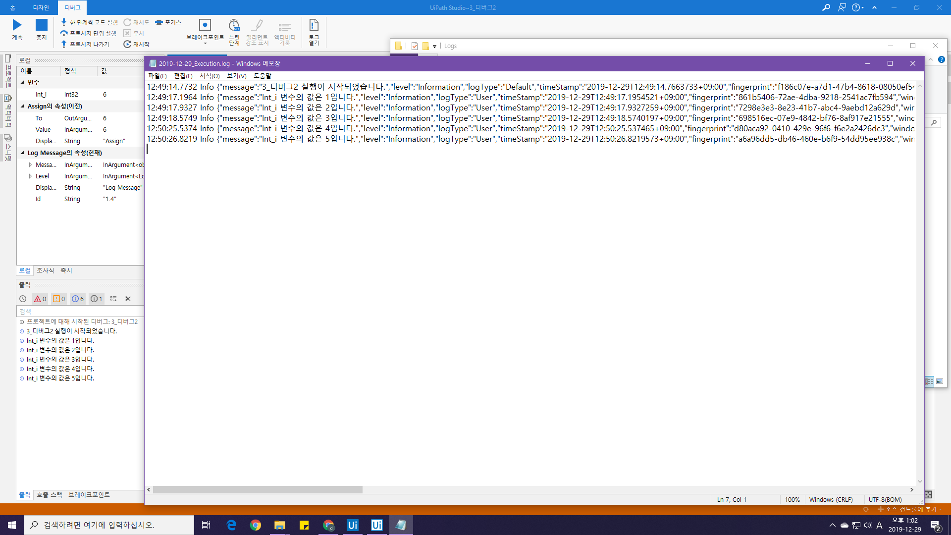 Log Message 액티비티를 통해 출력기록된 메시지는 로그파일에도 기록됩니다. 로그는 지난시간에 알려드렸던 대로 [로그 열기] 버튼을 눌러 확인할 수 있습니다.
