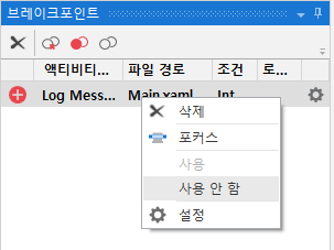 이처럼 여럽게(?) 설정한 브레이크포인트를 잠시 동작되지 않도록 해야할 필요성있습니다. 이럴땐 브레이크포인트 창에서 사용하지 않을 중단점에 컨텍스트 메뉴를 열어 사용여부를 설정할 수 있습니다.