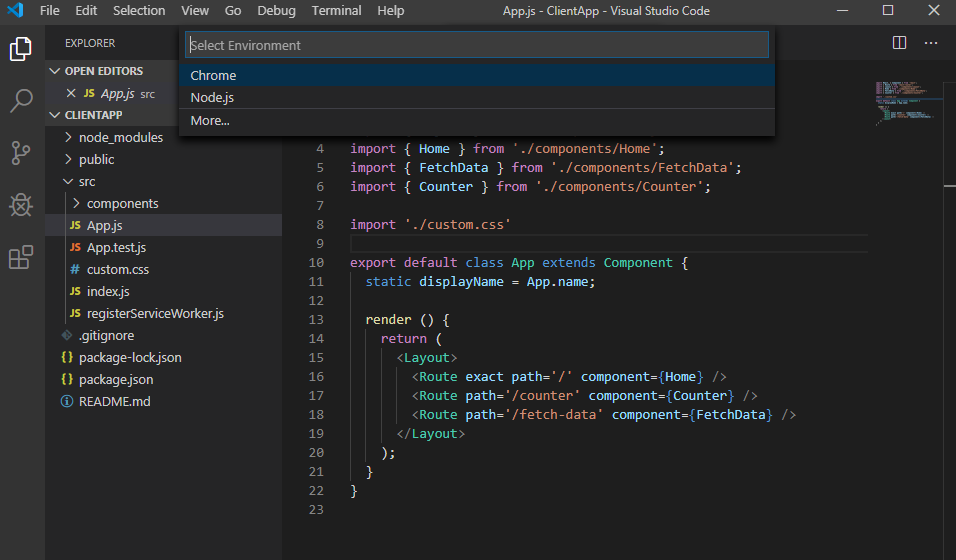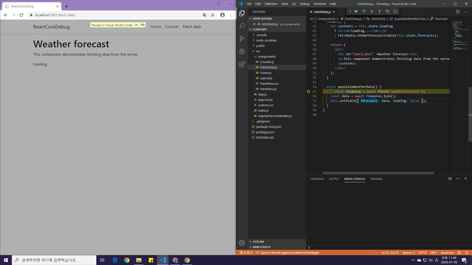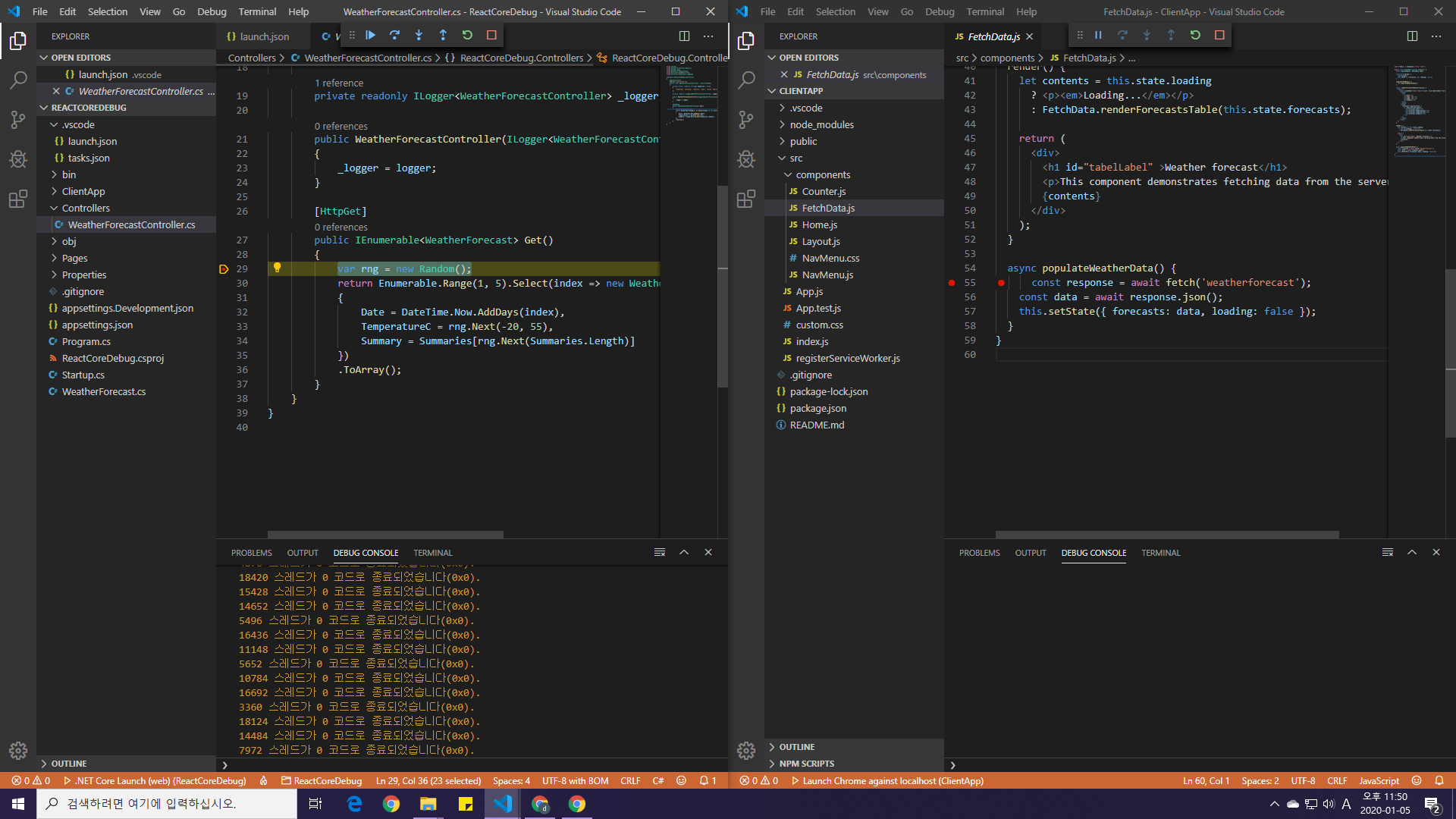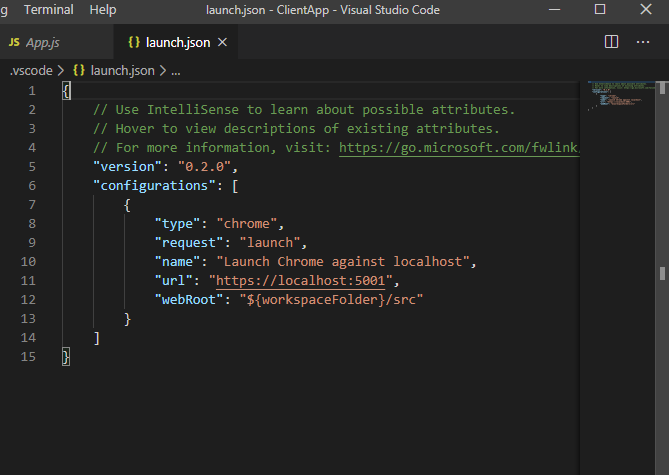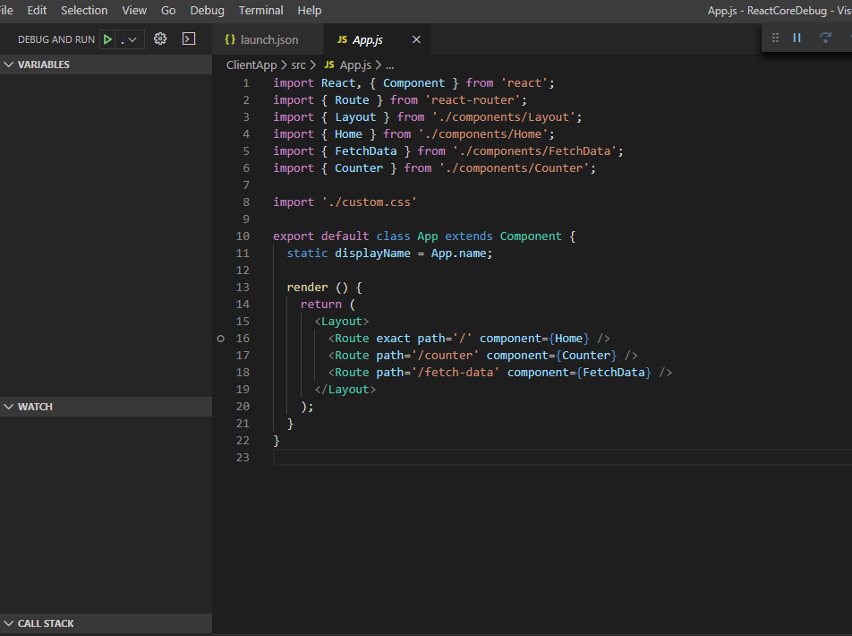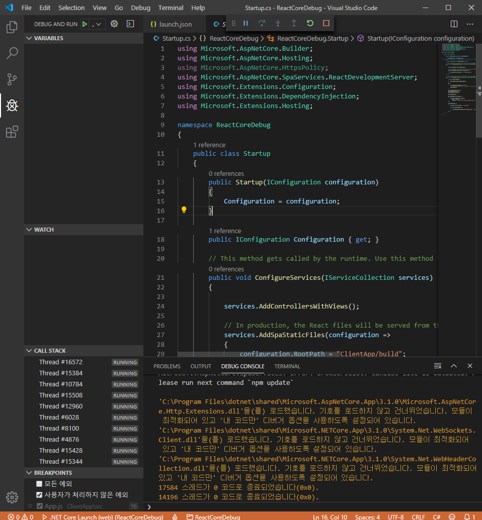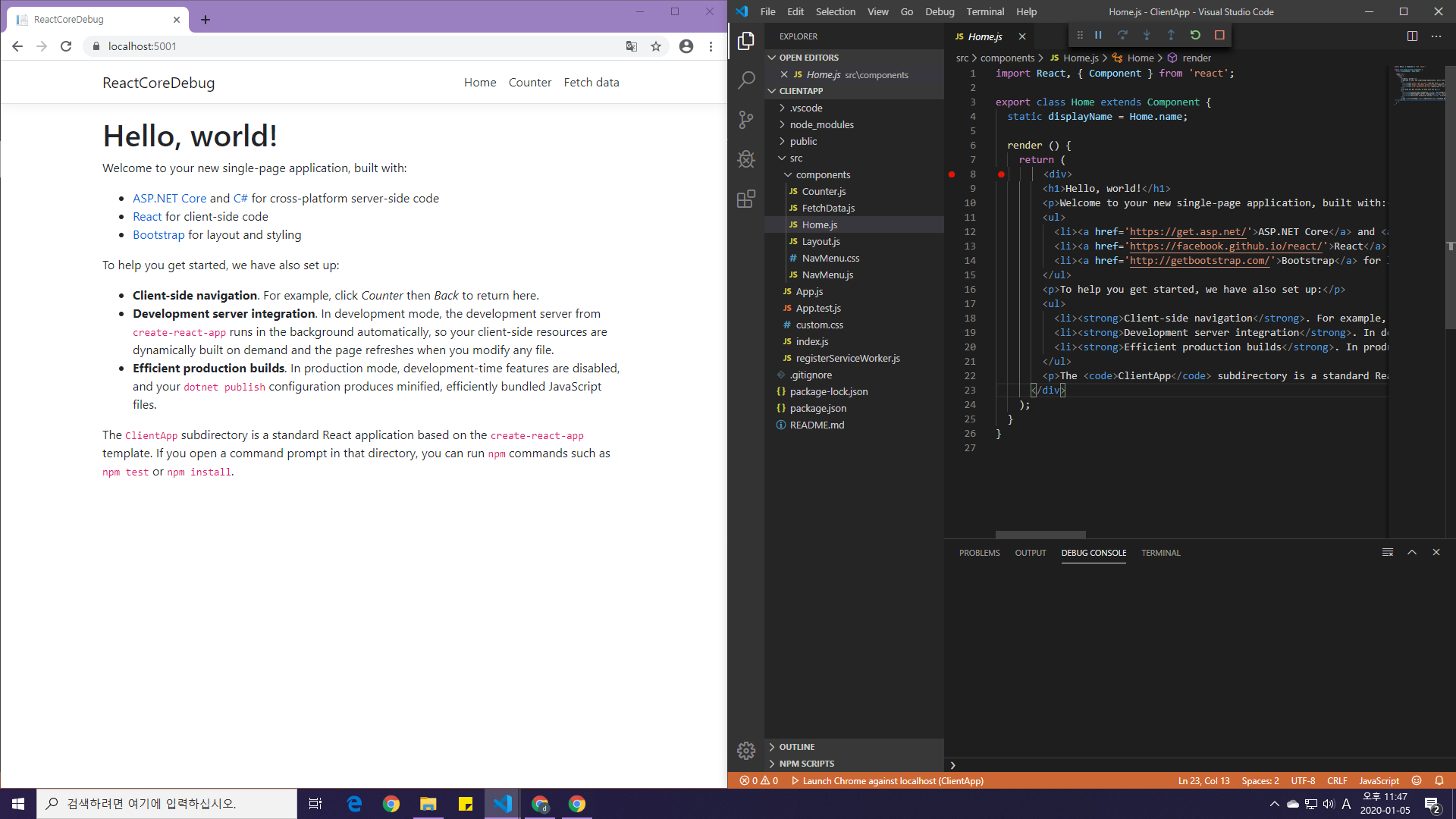 .NET Core로 리액트기반 SPA(Single Page Application)를 개발해보고자 dotnet 명령어로 react 프로젝트를 생성하였다.생성 후 VS Code로 연 뒤, 아무 .cs 파일이나 열어주고 디버깅하면 알아서 디버그 관련 파일(launch.json, tasks.json)이 자동생성되니 서버 사이드 쪽 디버깅은 쉬웠다.