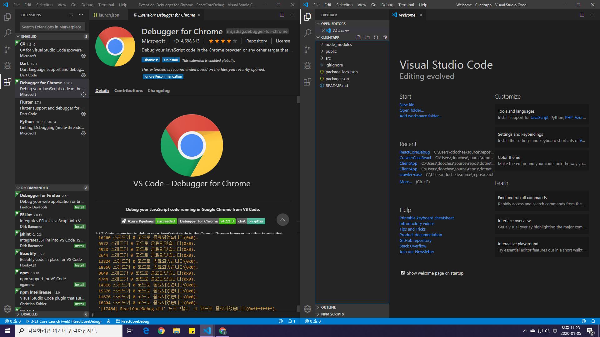 프로젝트 폴더 내 ClientApp 폴더를 별도의 VSCode로 연다.