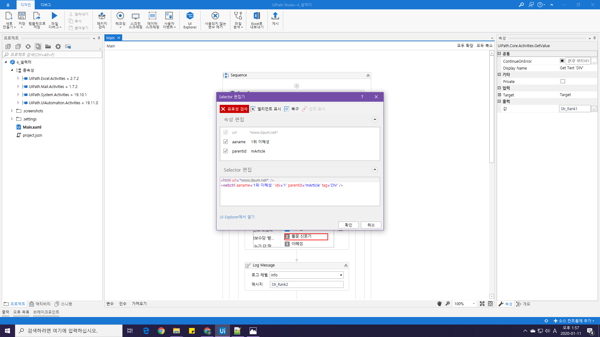 [UiPath 기초] 4. 셀렉터(Selector) - 4 (0) 2020.01.27 [UiPath 기초] 4. 셀렉터(Selector) - 3 (0) 2020.01.19 [UiPath 기초] 4. 셀렉터(Selector) - 1 (0) 2020.01.11 [UiPath 기초] 3. 디버그(Debug) - 3 (0) 2019.12.29 [UiPath 기초] 3. 디버그(Debug) - 2 (0) 2019.12.22