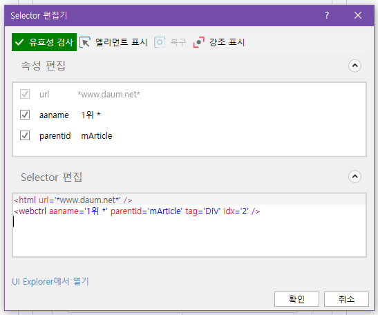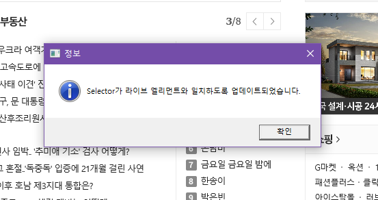 3. 정보창 확인선택을 완료하면 "Selector가 라이브 엘리먼트와 일치하도록 업데이트되었습니다." 라는 메시지박스가 표시됩니다. 확인버튼을 누르면 셀렉터 값이 변경된 것을 확인할 수 있습니다.