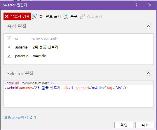 Selector 편집기가 열린 모습 편집기 화면을 살펴보시면, 유효성 검사 부분에 X 표시와 함께 빨간색으로 표시된 것을 확인할 수 있습니다. 이 상태는 해당 엘리먼트를 찾을 수 없는 상태임을 의미합니다. 그럼 어떻게 복구해야 할까요?