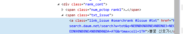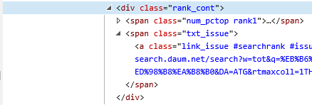 Daum 사이트(왼쪽)와 Daum의 Html 구조(오른쪽) 제가 선택한 영역은 'class' 속성에 "rank_cont" 가 있는 영역 선택한 것이고,