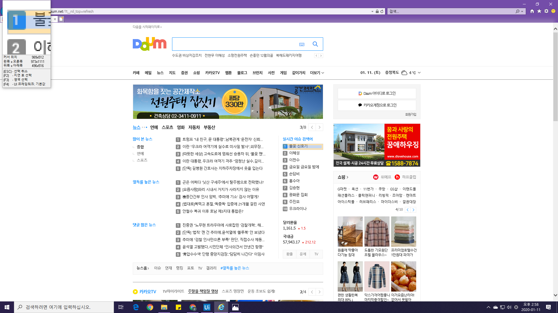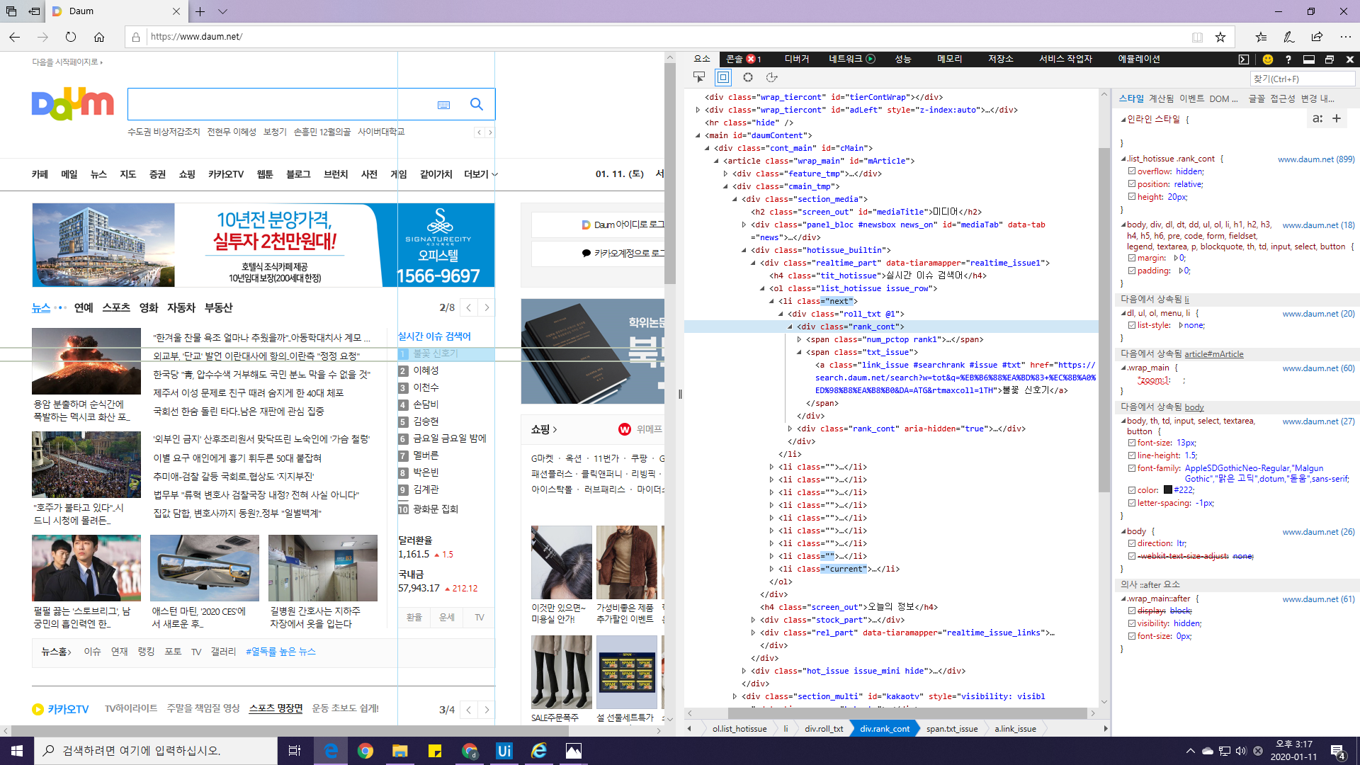 미묘한 차이가 생기는 원인은 육안으론 보이지 않지만, Daum 사이트를 이루고 있는 HTML 태그가 겹겹히 쌓여있기 때문입니다. html 구조를 보고싶으시다면 IE나 크롬과 같은 잘 알려진 인터넷 브라우저에서 F12를 눌러 아래 이미지처럼 <html>,<div>,<li> 등 여러 태그가 조합된 문서구조를 확인할 수 있습니다.