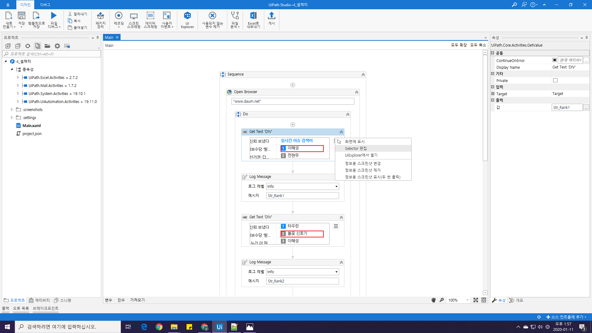 우선 1순위부터 수술(?)해보겠습니다. 첫번째 Get Text 액티비티 오른쪽의 '햄버거 버튼'을 누른 뒤, Selector 편집을 눌러주세요.