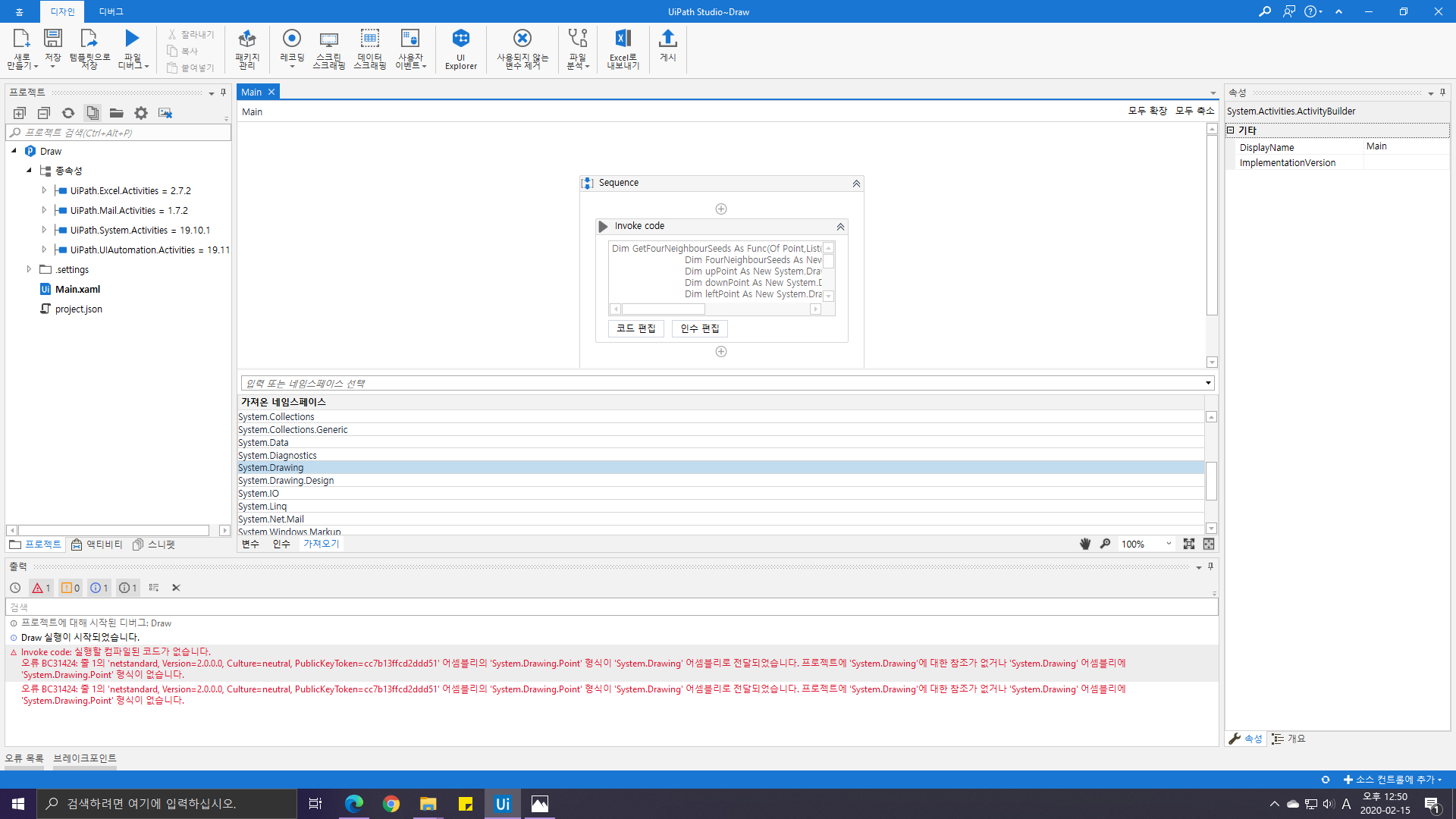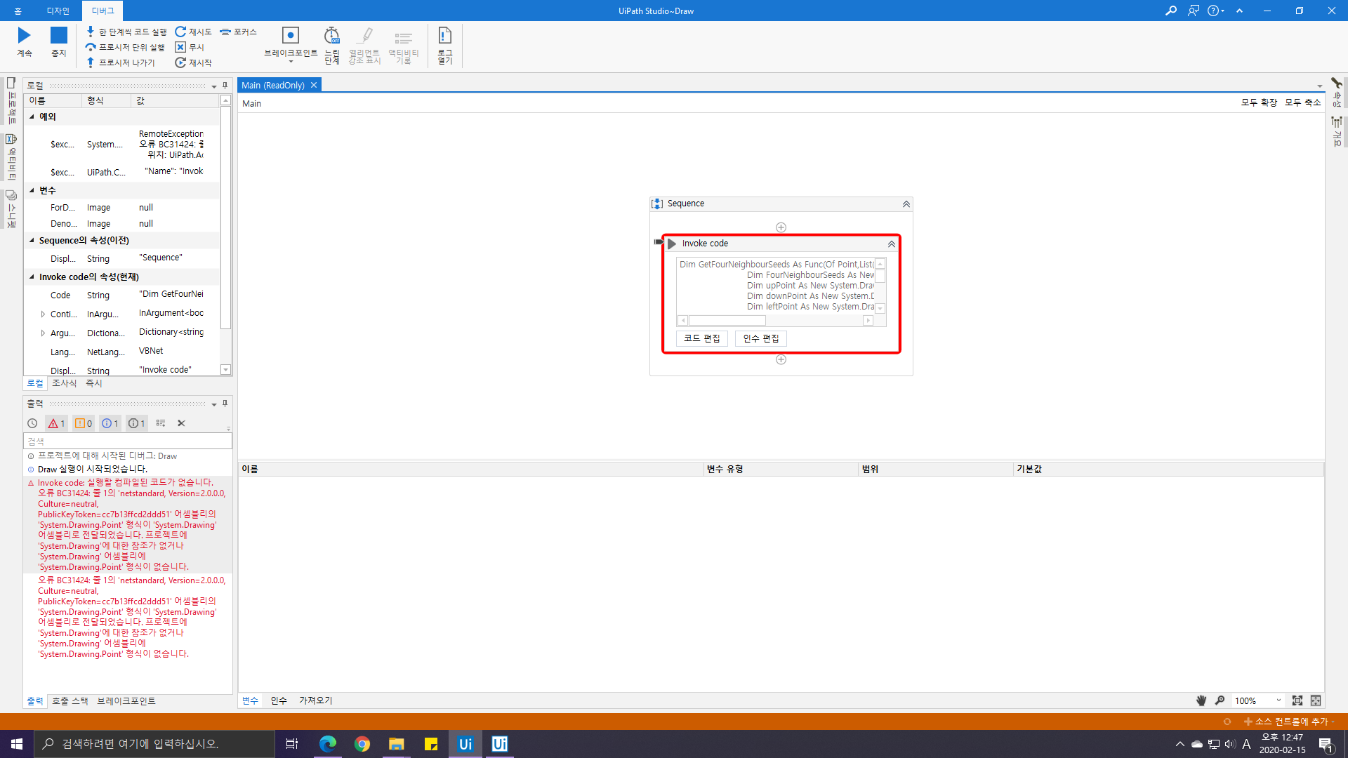 개발자는 'Invoke Code'에 System.Drawing.Point 타입을 사용하여 어떤 작업을 수행하게끔 코드를 입력했는데, 네임스페이스 선언이나, 코드오류가 없음에도 불구하고 실행시 오류가 난다는 내용이었습니다.