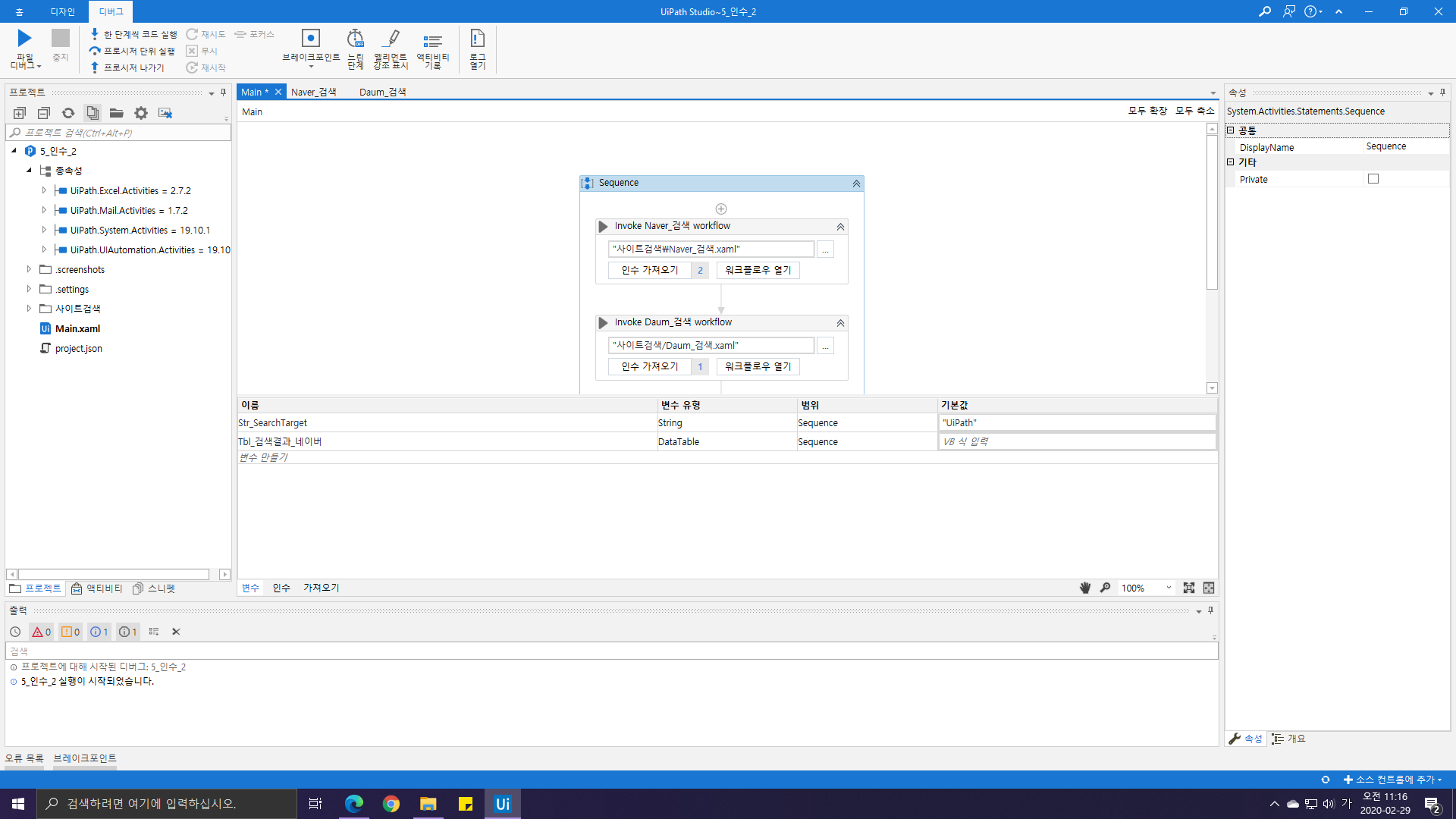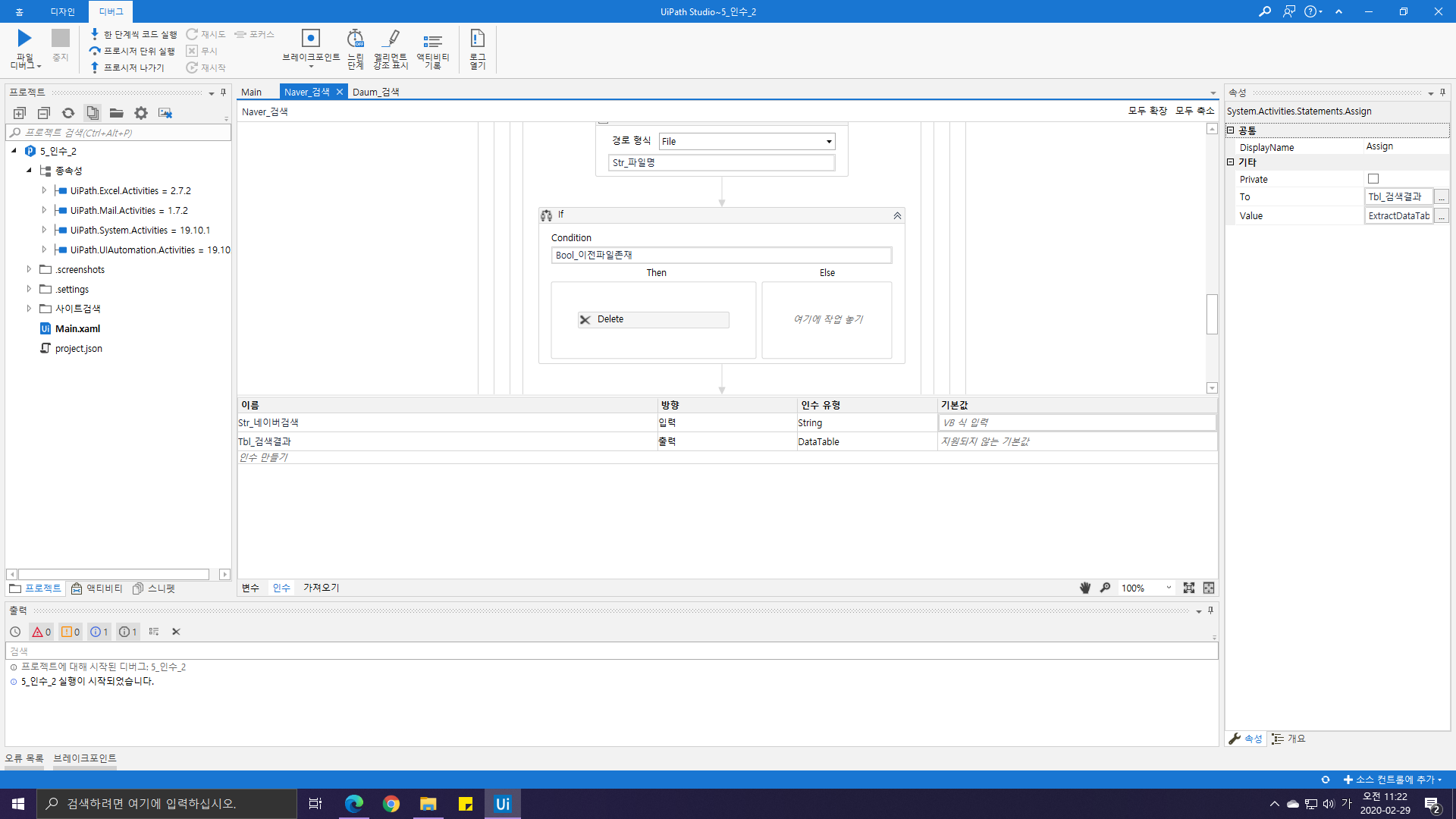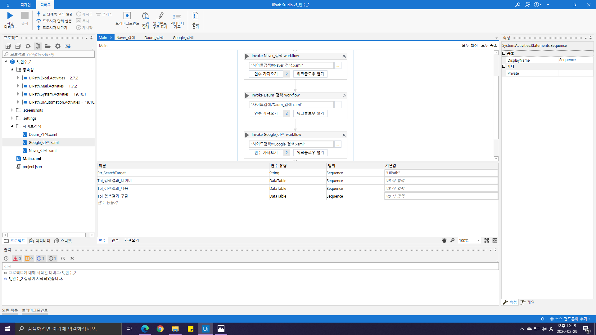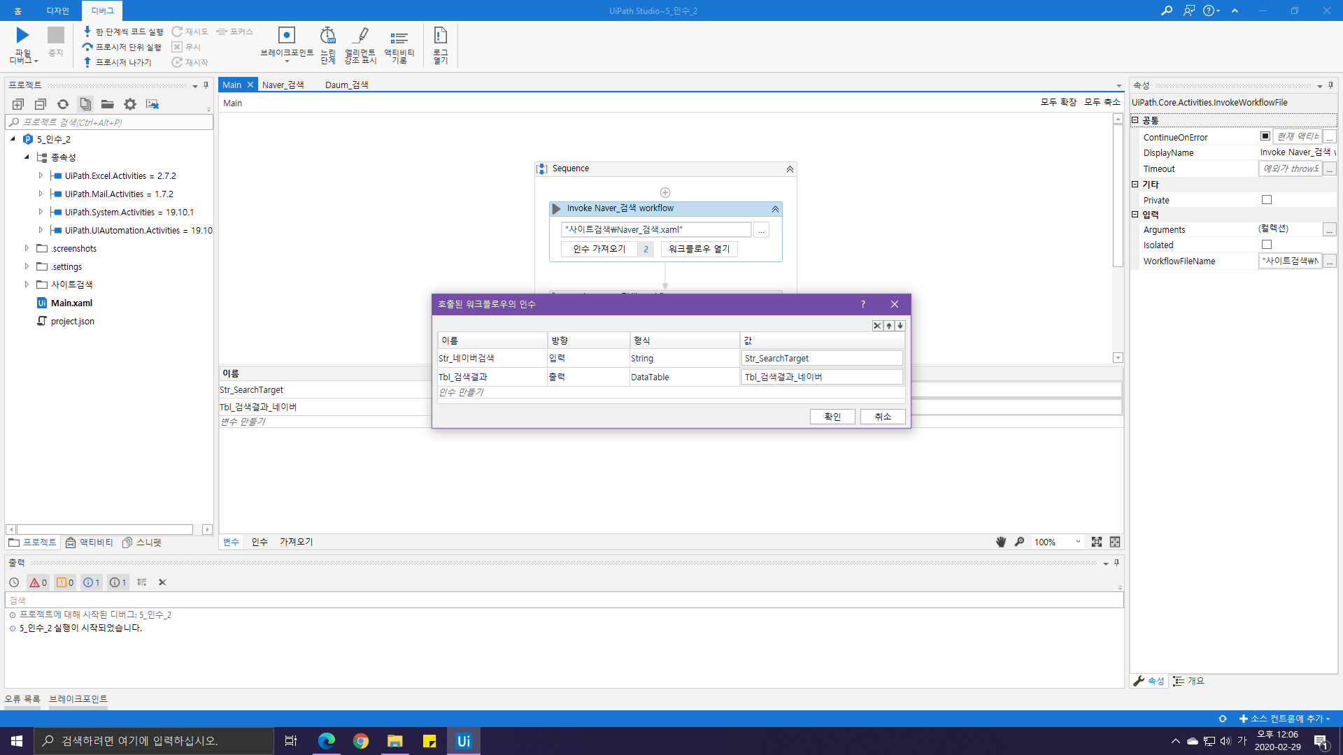 추가한 인수를 Main 워크플로우의 "Tbl_검색결과_네이버" 변수에 대입합니다.