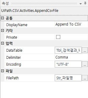 * 글자가 깨져나오는 경우가 있다면 Append To CSV 액티비티 속성 중 Encoding 에 "UTF-8"을 입력해주세요.