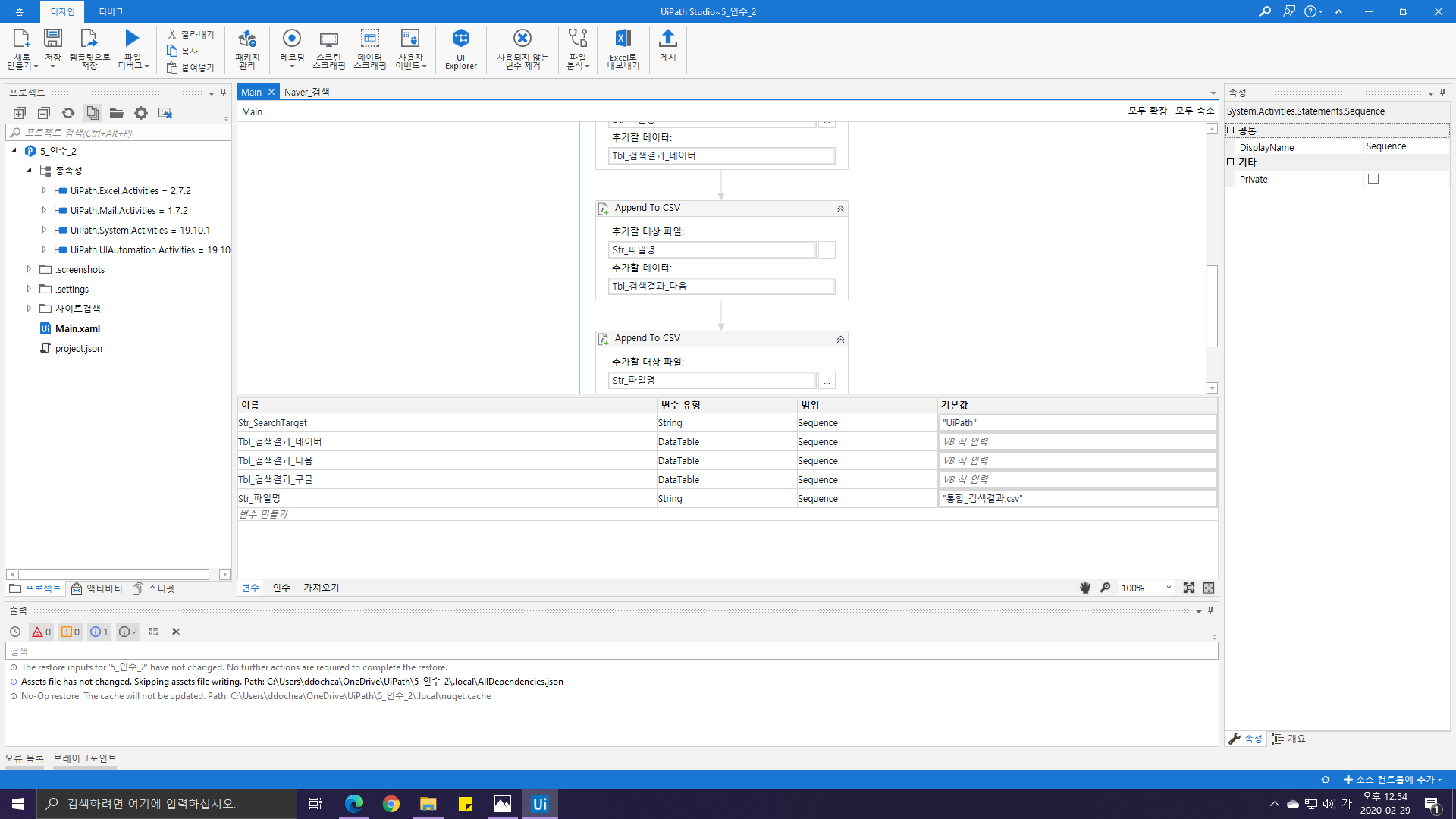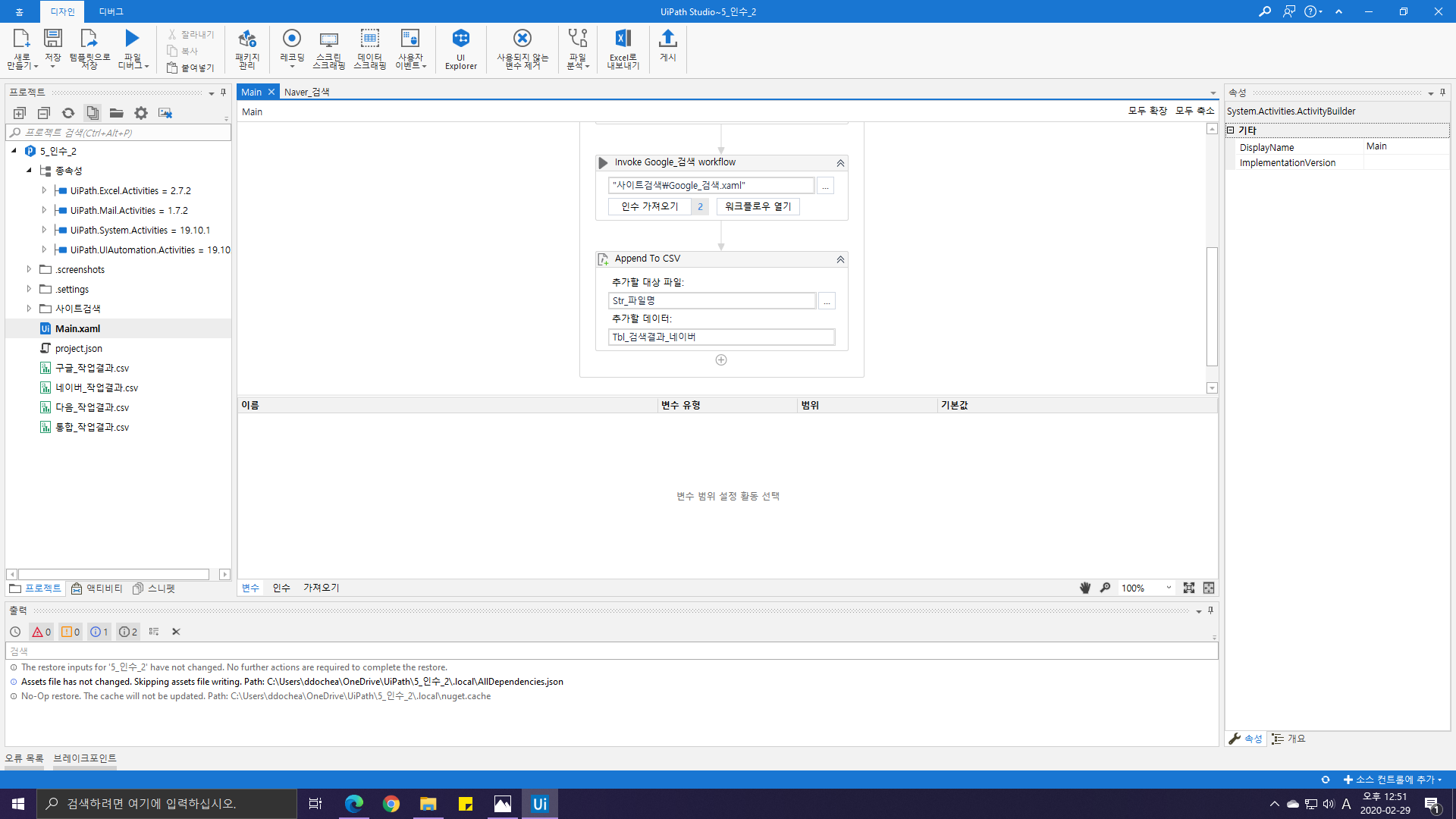 검색결과를 저장하기위해 Append To CSV 액티비티를 추가하고, 파일명변수와 가져온 검색결과 테이블변수를 설정해주세요.