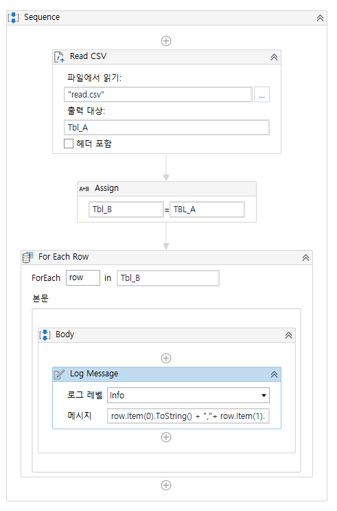 예제 프로세스 전체 내용 이제 해당 예제에 딱 한 가지 작업만 해보겠습니다. Assign 과 For Each Row 사이에 Add Data Row 액티비티를 추가하고 속성을 아래와 같이 설정해주세요.
