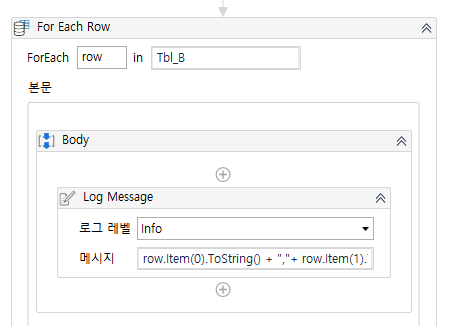 혹시 이상한 점 눈치채셨나요? 로그결과를 출력하는 For Each Row 액티비티를 자세히 봐주시기 바랍니다.