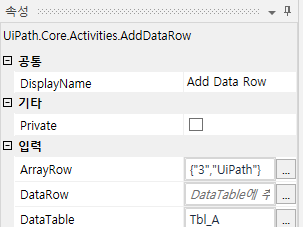 Tbl_A 변수에 row 추가 ArrayRow 에는 {"3", "UiPath"}, 추가할 위치는 Tbl_A로 설정하였습니다.