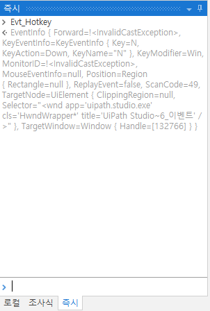 Get Event Info에서 일시정지한 워크플로우 이 상태로, F11 또는 '한 단계씩 코드 실행' 을 눌러, Get Event Info가 진행되게 합니다.