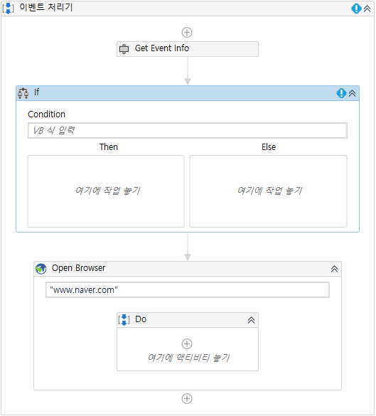 이제 참 거짓을 판단할 변수가 생겼으니 본격적으로 If를 사용해보겠습니다. 먼저 If 액티비티를 Get Event Info와 Open Browser 사이에 배치합니다.