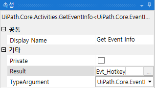 가져온 이벤트를 EventInfo 변수에 대입하기위해 Get Event Info 의 Result 속성에 변수명을 입력합니다.