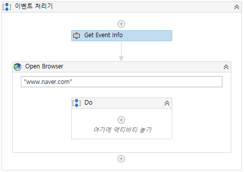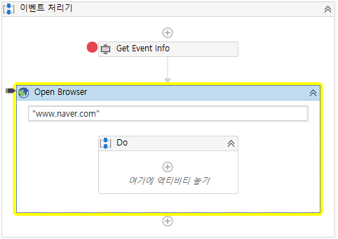 Open Browser 액티비티 실행전에 판단이 필요하므로, 기존 Open Browser 액티비티 앞에 [입력키 값]을 가져오는 액티비티와 If를 추가해야할 것입니다. 입력키 값은 지난번 소개드린대로 'Get Event Info' 액티비티로 해결할 수 있습니다.