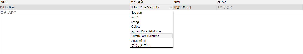 * 변수유형이 안보일 경우, 형식 찾아보기에서 찾아서 추가하시면 됩니다.