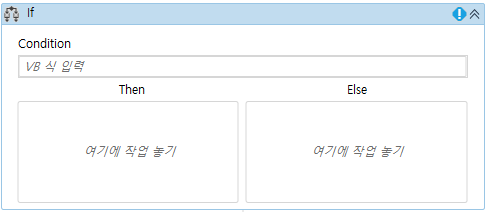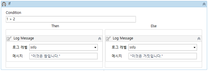 If 액티비티 Condition 조건에 입력한 식의 결과가 참(true)면 Then에 배치한 액티비티를, 거짓(false)이면 Else에 배치한 액티비티를 실행합니다. 아래 예제는 "이것은 거짓입니다." 라는 메시지를 표시합니다.