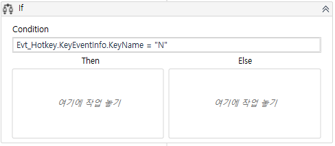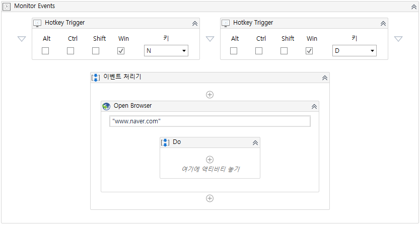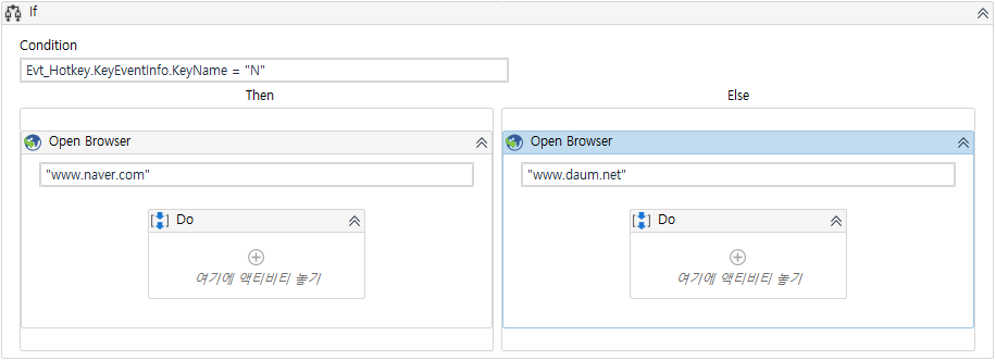 이대로만 설정하면 Win+N 키 와 Win+D 키 모두 네이버 홈페이지를 띄우게 됩니다. Win+N을 눌렀을땐 네이버, Win+D를 눌렀을땐 다음 사이트가 표시되도록 분기해야 합니다. 이럴때 사용하는 것이 IF 액티비티입니다.