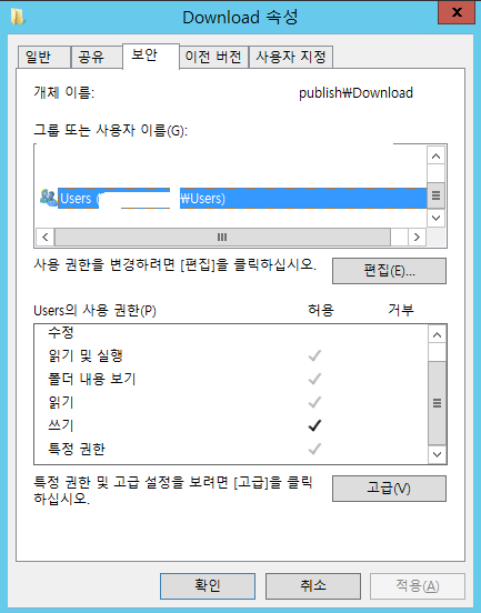 다운로드가 가능하게 하려면 웹 서비스 내 다운로드 폴더에 "쓰기"권한을 추가해줘야 한다. TEST 계정만 설정이 안되므로 Users에 설정했다.