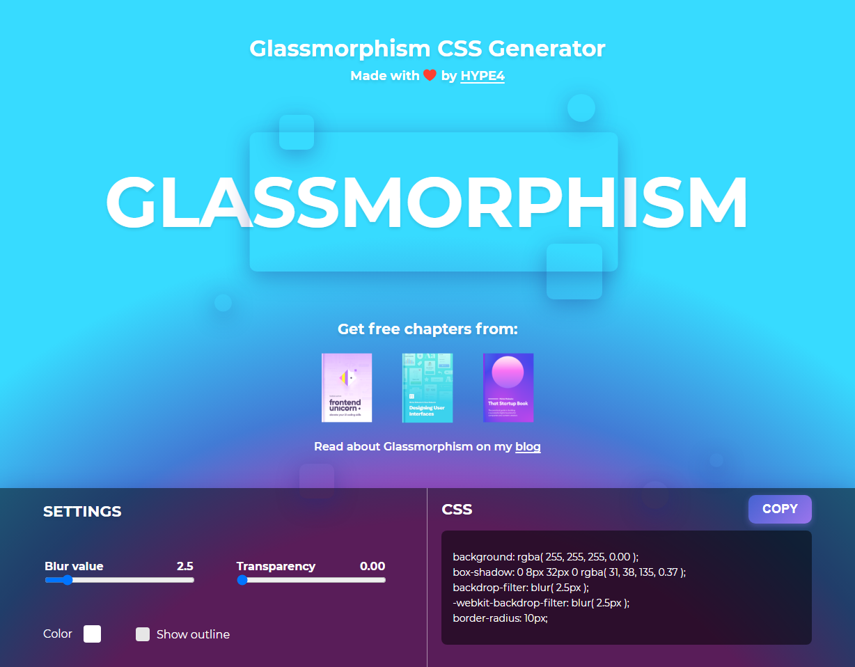 사이트에 접속해보면 해당 페이지 1개 뿐이며, SETTINGS를 조작하면 상단의 디자인과 오른쪽 CSS 코드가 변경되는것을 확인할 수 있다. 원하는 설정을 적용 후 COPY 버튼을 눌러 자신의 프로젝트에서 사용하면 된다.