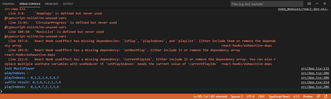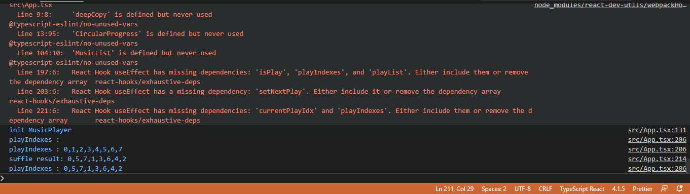 useEffect(() => { console.log(`playIndexes : ${playIndexes}`); }, [playIndexes]); useEffect(() => { if(isSuffle) { const p = playIndexes; const rndTargets = [...p.slice(0, currentPlayIdx), ...p.slice(currentPlayIdx + 1, p.length)].sort(p => Math.random() - Math.random()); const result = [...rndTargets.slice(0, currentPlayIdx), p[currentPlayIdx], ...rndTargets.slice(currentPlayIdx, p.length)]; console.log(`suffle result: ${result}`); setPlayIndexes(result); } else { setPlayIndexes(p => p.sort()); } }, [isSuffle]);